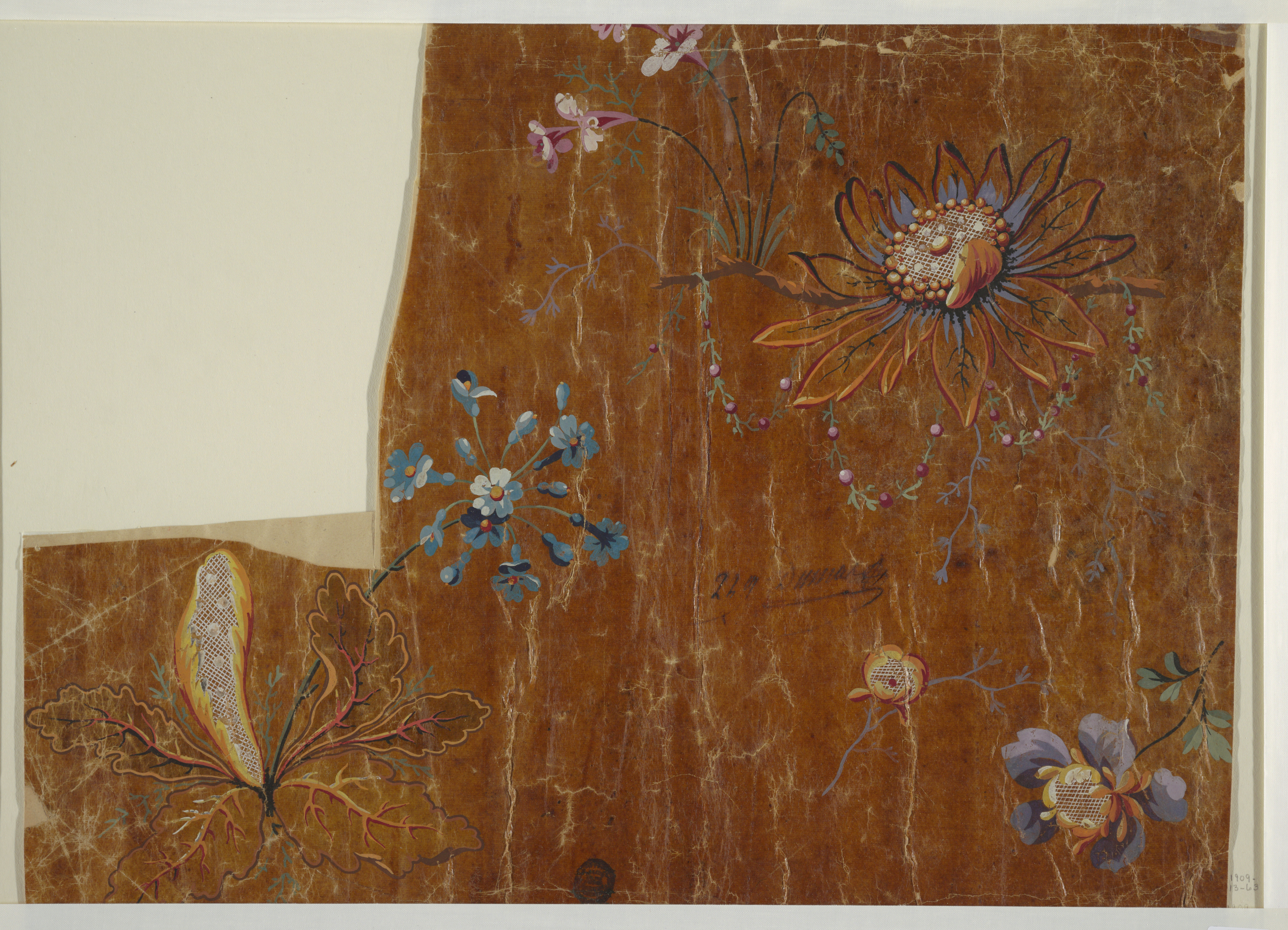 Drawing, Design for an Embroidered Woven Fabric, Fragment; France; brush and gouche on oily tracing paper; (Left and Top edges): 15.5 × 31.5 cm (6 1/8 × 12 3/8 in.) (Right and Bottom edges): 36.5 × 46.5 cm (14 3/8 × 18 5/16 in.); Gift of Eleanor and Sarah Hewitt; 1909-13-63