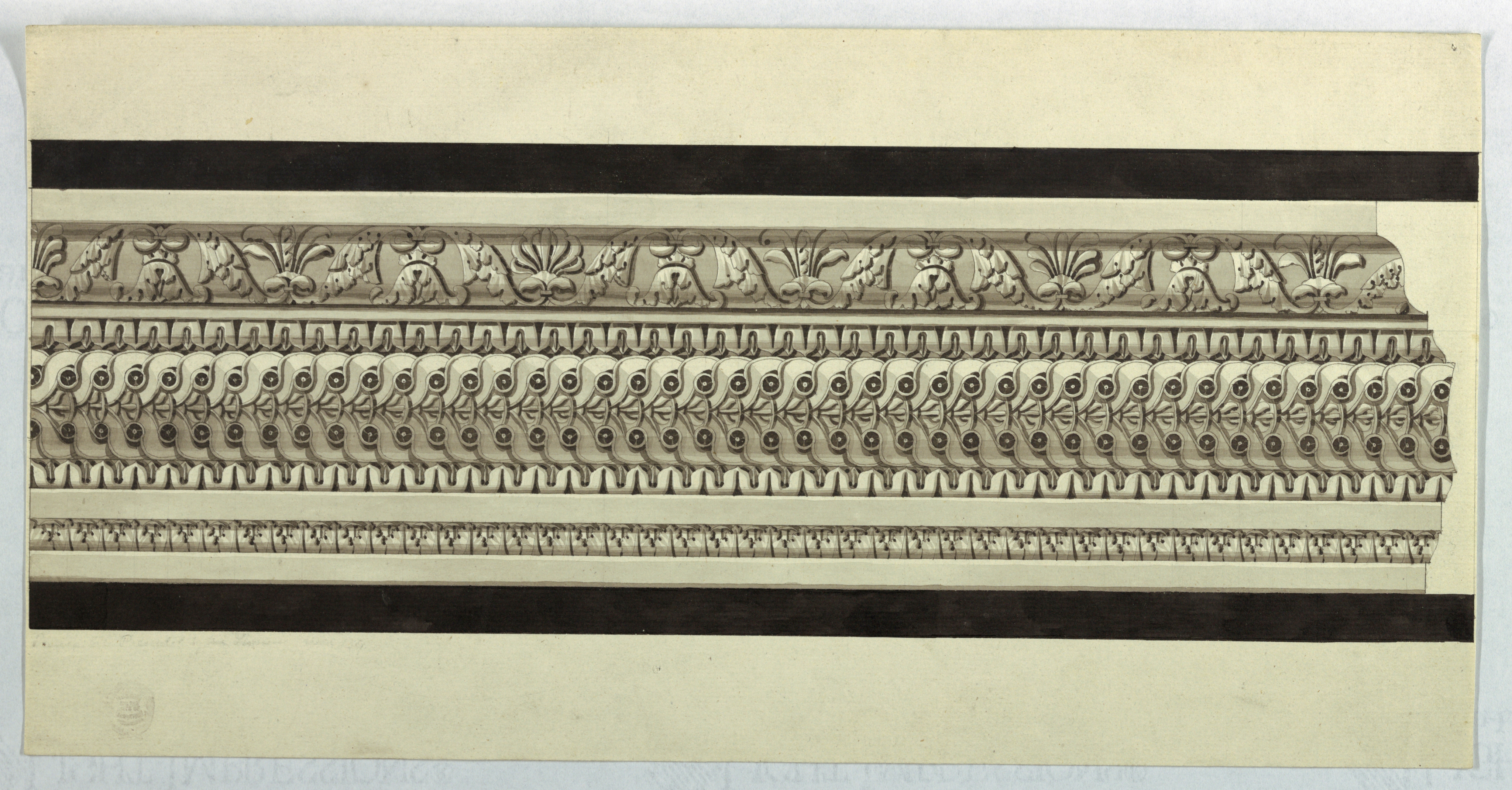 Drawing, Design for the Decoration of Mouldings; C. C. (French, active 19th c.); France; graphite, pen and black ink, brush and gray watercolor, black on light creamy paper; 22.8 × 44.9 cm (9 in. × 17 11/16 in.); Gift of Eleanor and Sarah Hewitt; 1909-13-9