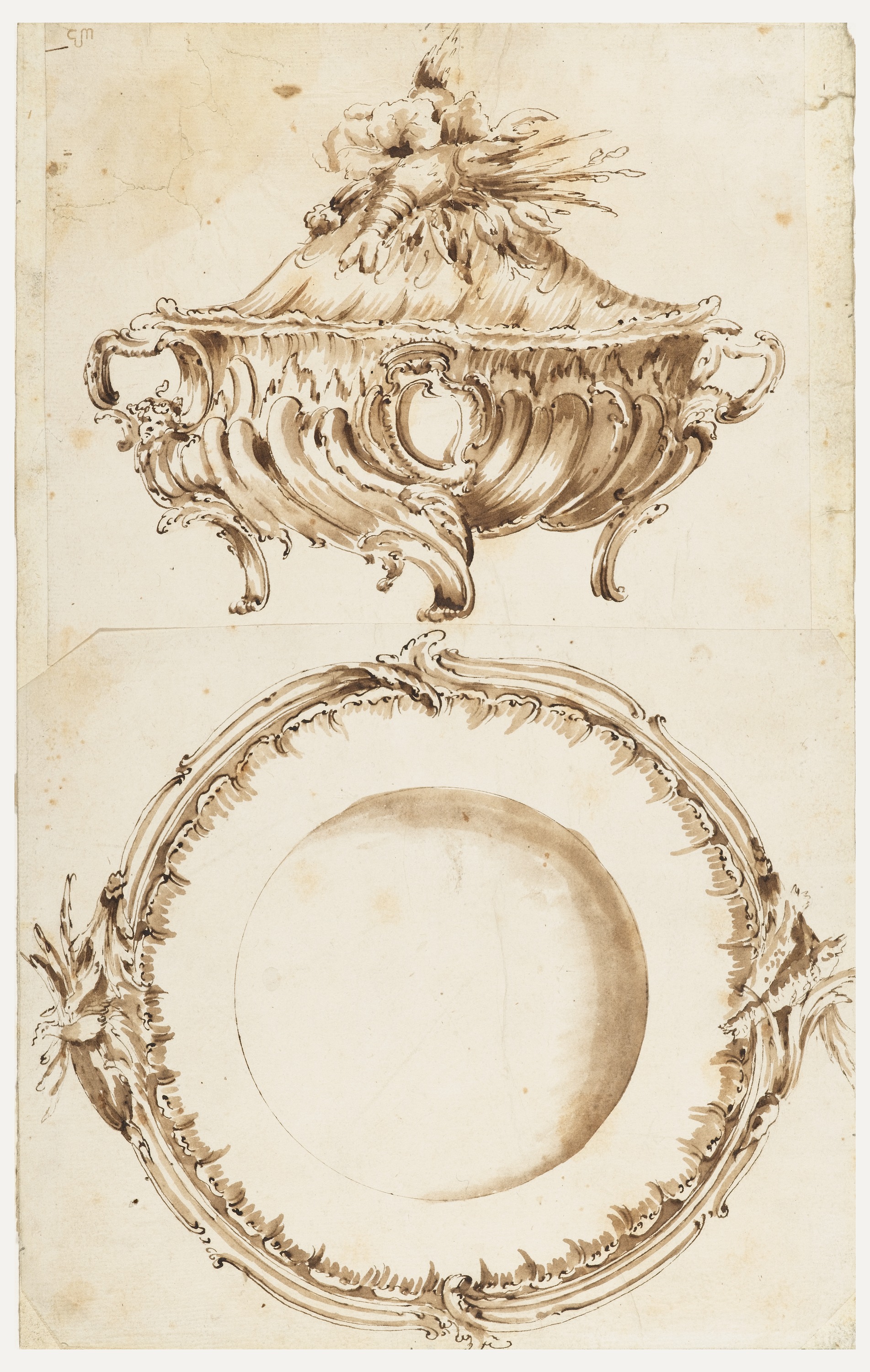 Drawing, Design for a Tureen and a Platter; Unknown; Attributed to Thomas Germain; Designed by Anonymous; France; graphite, pen and brown ink, brush and sepia wash on two joined sheets of paper; Sheet: 15.3 x 18.3 cm (6 x 7 3/16 in.) Mat: 45.7 x 35.6 cm (18 x 14 in.); Purchased for the Museum by the Advisory Council; 1911-28-160-a