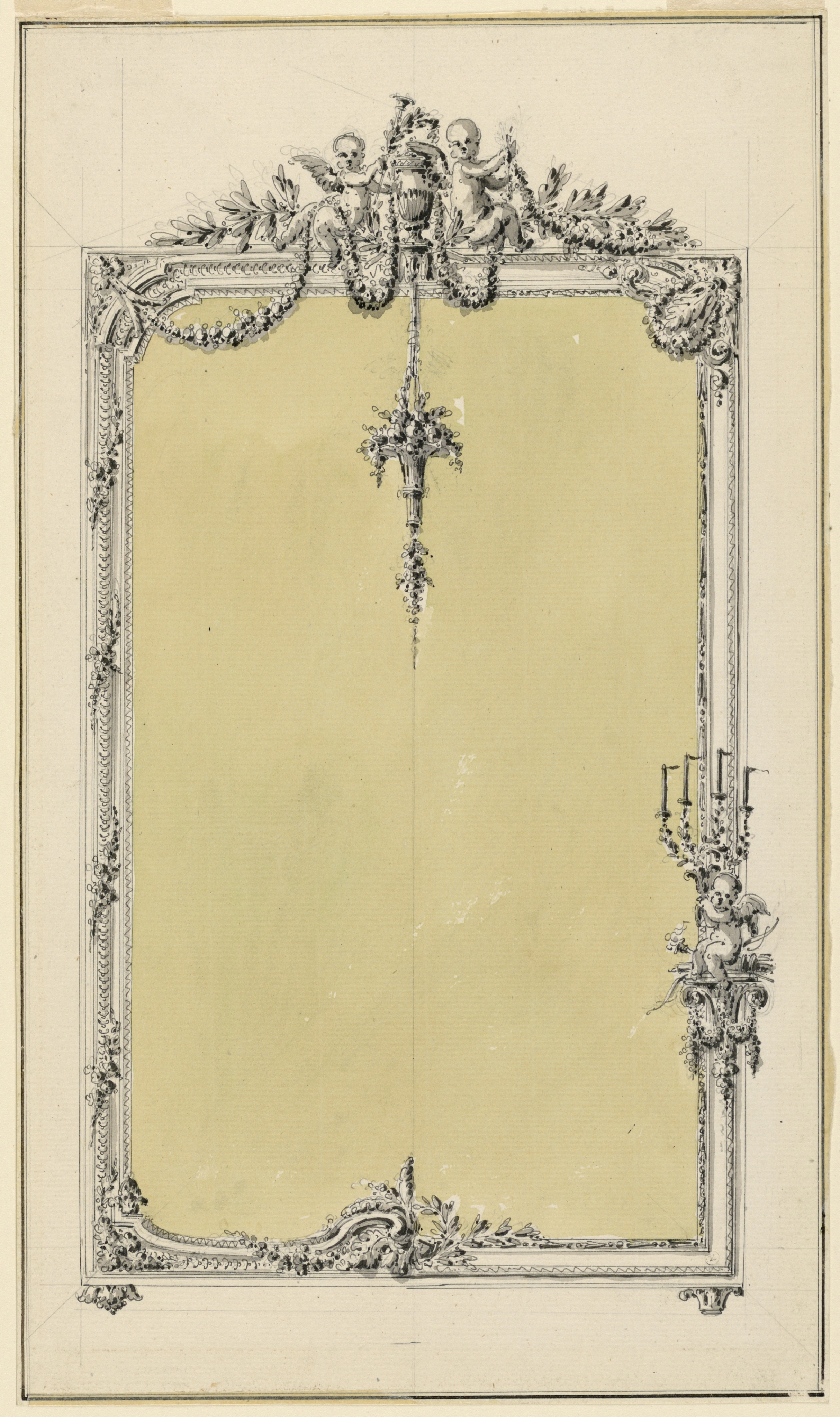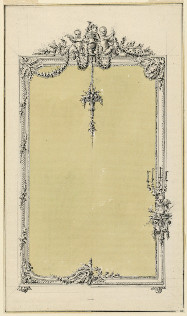 Drawing, Design for a Mirror Frame, with Alternative Suggestion; Designed by Richard de Lalonde (French, active 1780–96); France; pen and black ink, brush and wash, light olive watercolor, graphite on white laid paper; 35.2 x 20.6 cm (13 7/8 x 8 1/8 in.); Purchased for the Museum by the Advisory Council; 1911-28-193