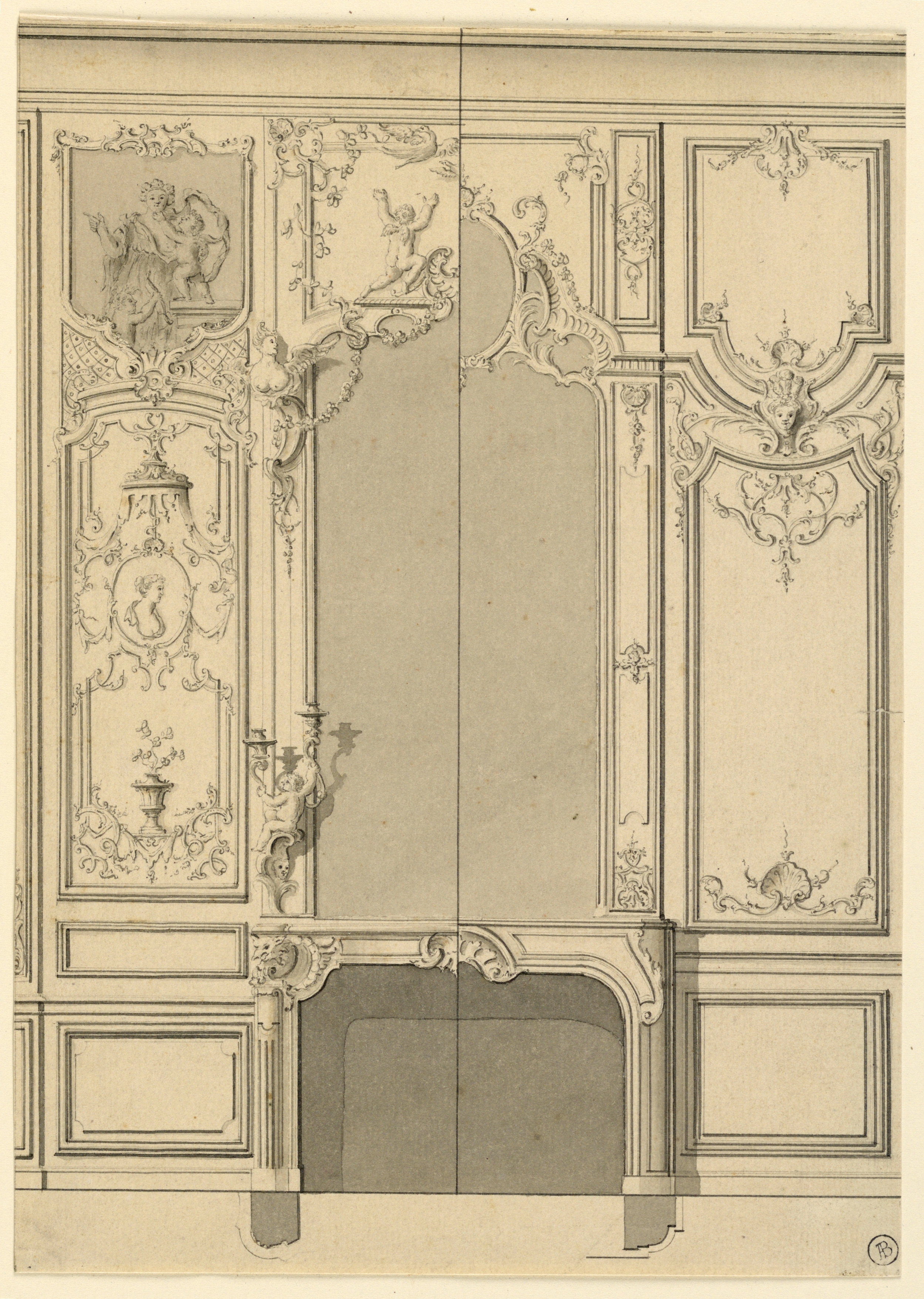 Drawing, Design for a Chimney Piece and Adjoining Bays with Alternative Suggestions; After Nicolas Pineau (French, 1684-1754); France; pen and brown ink, brush and brown and gray wash on cream laid paper; 28.3 x 22.2 cm (11 1/8 x 8 3/4 in.); Purchased for the Museum by the Advisory Council; 1911-28-252