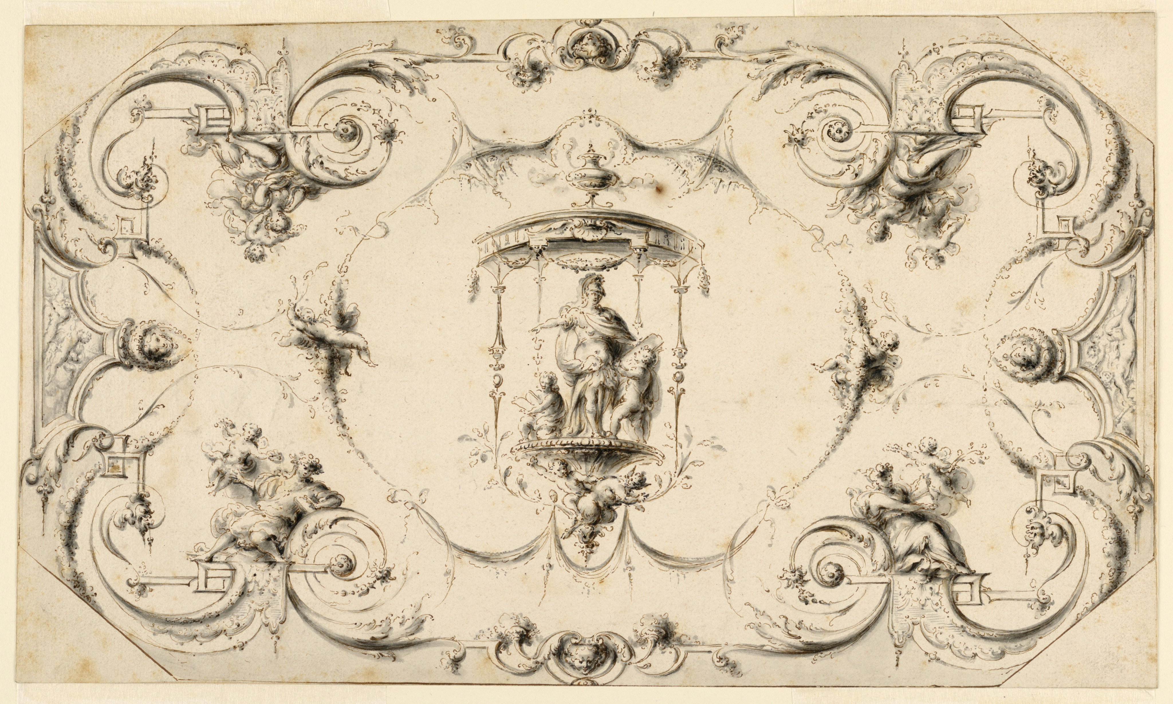Drawing, Design for the Decoration of an Oblong Octagonal Ceiling; Henri Sallembier (French, ca. 1753 - 1820); France; pen and black ink with brush and ink wash on paper; Sheet: 25.1 x 42.4 cm (9 7/8 x 16 11/16 in.); Purchased for the Museum by the Advisory Council; 1911-28-277