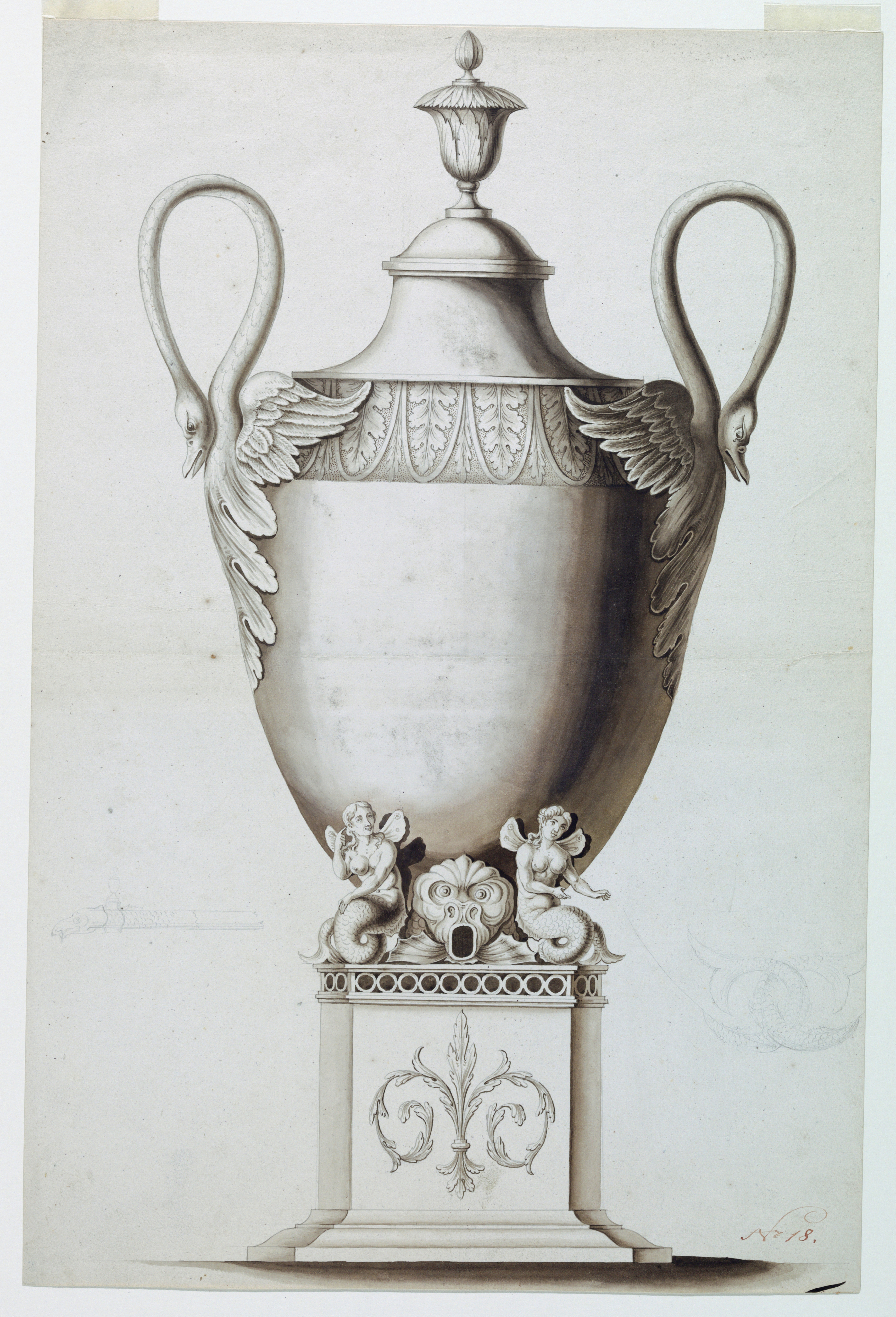 Drawing, Design for a Coffee Urn; Attributed to Johann Nepomuk; Germany; pen and gray ink, brush and gray-brown wash, graphite on paper; 49.1 × 32.5 cm (19 5/16 × 12 13/16 in.); Purchased for the Museum by the Advisory Council; 1911-28-323