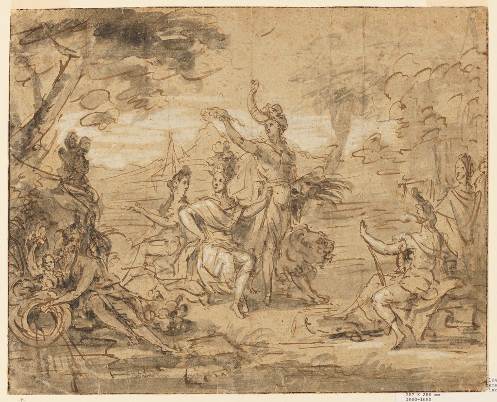Drawing, Design for a Tapestry: Allegory of Africa; Gérard Audran (Flemish, active in France, 1640–1703); France; brush and brown ink, black wash, white gouache,over black chalk on laid paper. framing lines in pen and black ink.; Sheet: 28.5 x 35.5 cm (11 1/4 x 14 in.); Purchased for the Museum by the Advisory Council; 1911-28-409