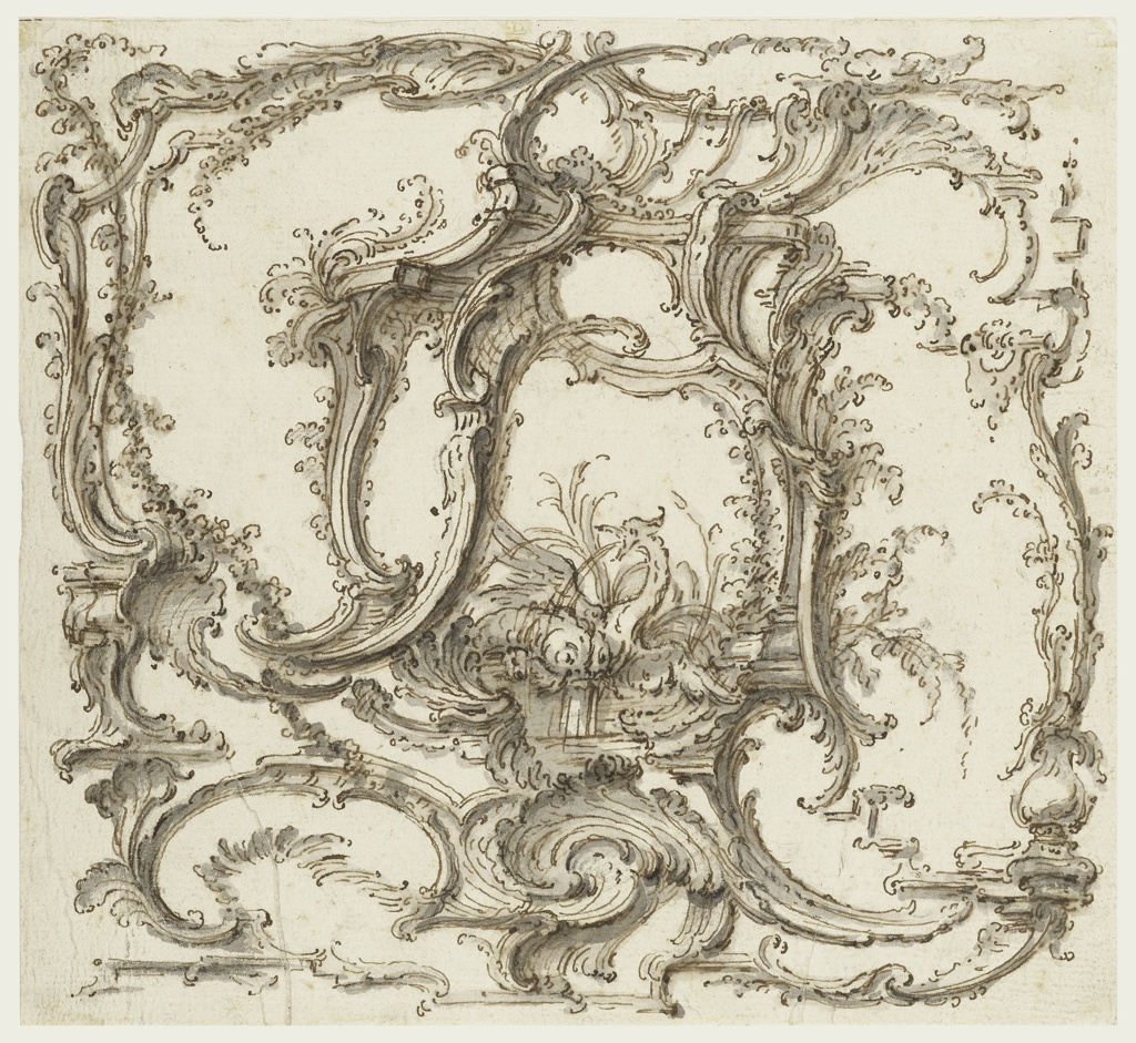 Drawing, Ornament Composition; P. Ludovik (French); Attributed to Pierre Edme Babel (French, 1720–1775); France; pen and brown ink, brush and gray wash, black chalk on white laid paper; Sheet: 18.2 x 20 cm (7 3/16 x 7 7/8 in.) Frame H x W x D: 50.2 x 39.7 x 2.5 cm (19 3/4 x 15 5/8 x 1 in.) Mat: 45.7 x 35.6 cm (18 x 14 in.); Purchased for the Museum by the Advisory Council; 1911-28-416