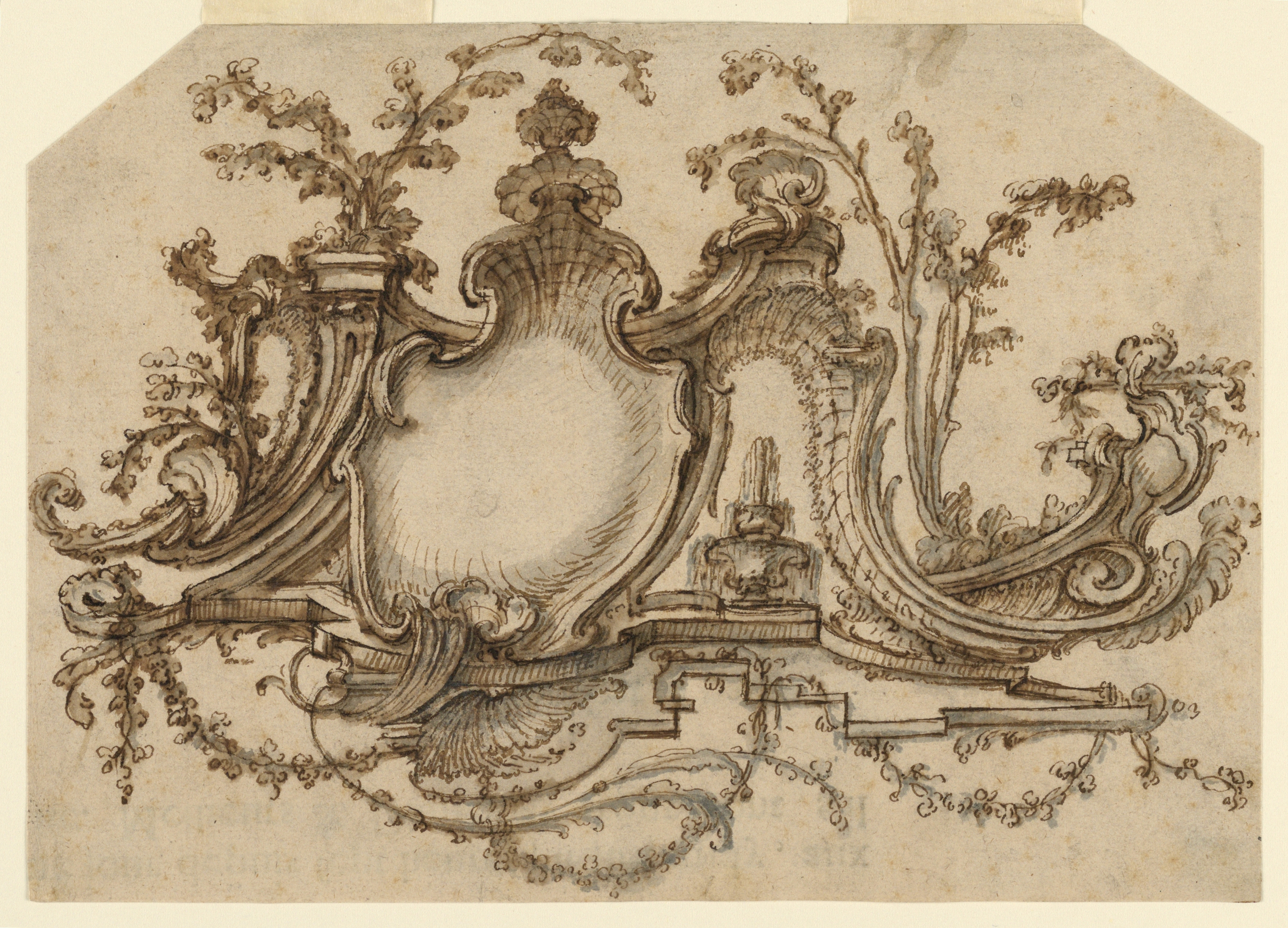 Drawing, Design for Panel Decoration with Rocaille Ornament; Designed by Pierre Edme Babel (French, 1720–1775); France; pen and black ink, brush and black and bistre wash on paper; 17.5 x 24.6 cm (6 7/8 x 9 11/16 in.); Purchased for the Museum by the Advisory Council; 1911-28-417