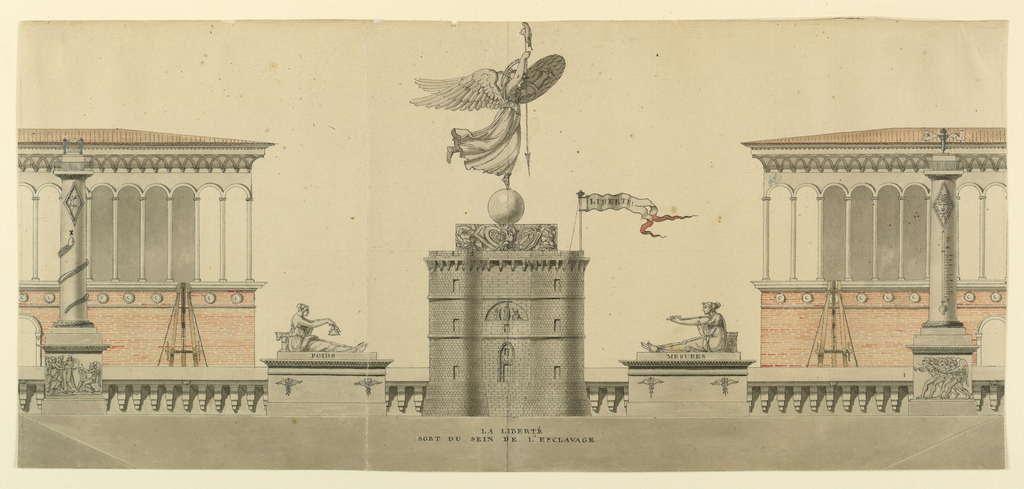 The monument can be compositionally divided into three parts. In the forefront is a row of five monuments, behind that a balustrade, followed by two cranes with two Tuscan loggias in the far background. The central monument is a combination of a pedestal in the shape of the eastern façade of the Bastille prison, which flies a small tricolor printed with “liberté.” Mounted on top is the personification of Liberty, imagined as a cross between Minerva with her crested helmet, shield, and spear, and Nike, the winged goddess of victory. This central monument is flanked on either side by the personification of weight (poids) and measurement (mesures), both depicted as classical female statues with accoutrements of their respective allegories. They rest on classical plinths that are marked with a caduceus, a symbol related to the god Mercury and employed since the Middle Ages as a symbol of diplomacy. At the far ends in this front row of monuments are designs for columns. On the left, a serpent wraps around a column that is marked with the Roman numeral for ten and a symbol of a moon. This particular column can be interpreted as a reference to the new French Republican calendar in which the months were divided not into weeks but in increments of ten days. The right column is transformed into a giant thermometer, perhaps alluding to the adoption of the decimal system in angular measurements. In the lower register is the following inscription: “La liberté sort du seine de l’esclavage” (Liberty emerged from the bosom of slavery), once more stressing the baseline of the French Revolution.