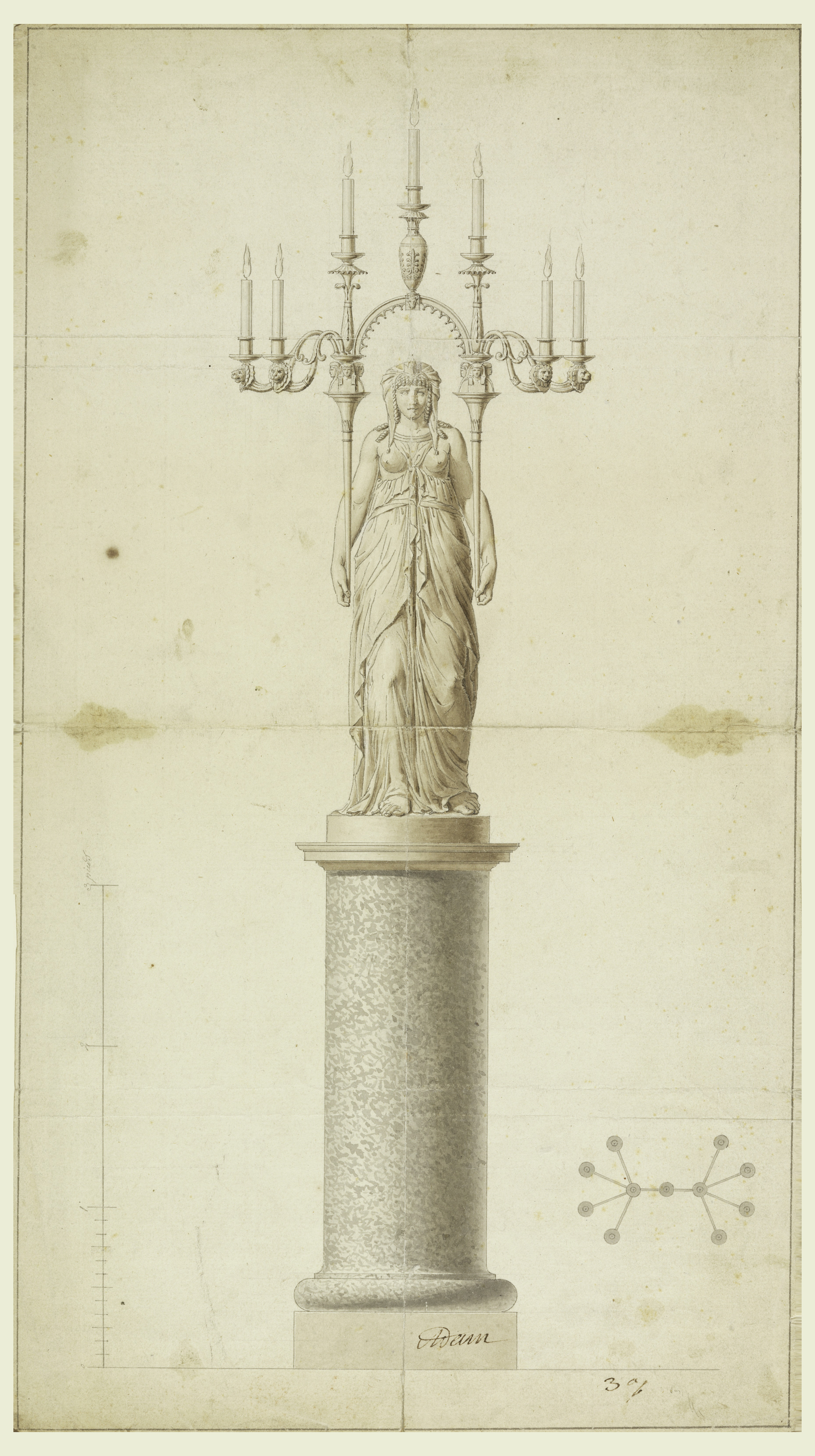 Drawing, Design for a Candelabrum; Possibly by Johann Jacob (ca. 1762–92); France; graphite, pen and black ink, brush and sepia wash, black ink on paper; 46.7 x 26.2 cm (18 3/8 x 10 5/16 in.); Purchased for the Museum by the Advisory Council; 1911-28-503