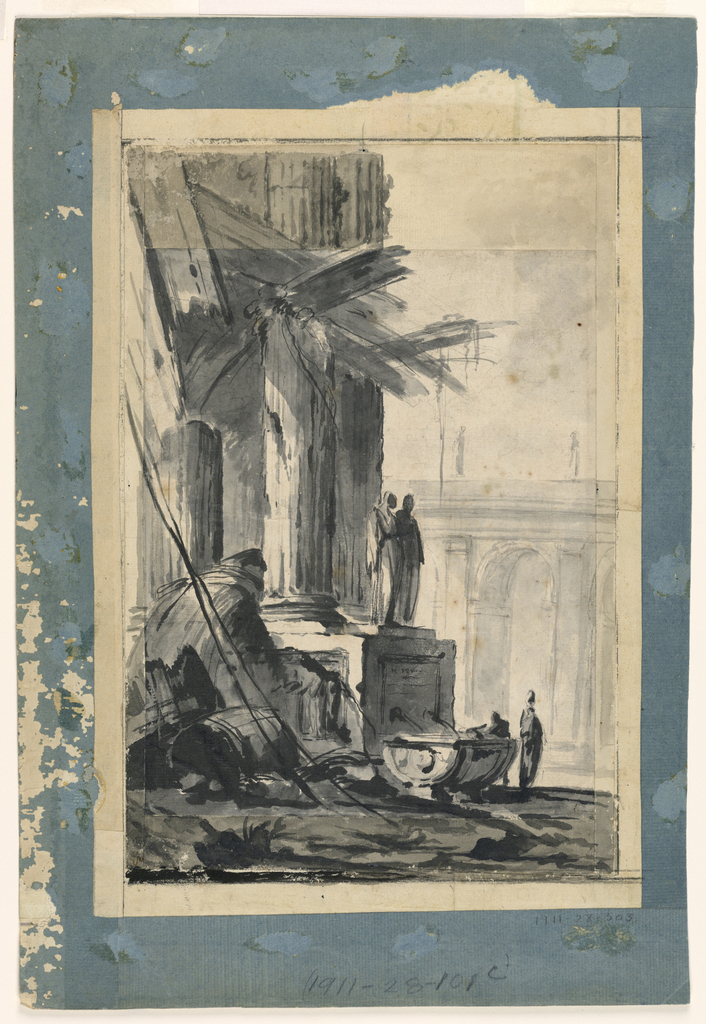 Drawing, Ruin Fantasy; Louis-Joseph Le Lorrain (French, 1715–1759); France; brush and black, gray wash, black chalk on cream laid paper; Overall sheet size with additions: 34.9 x 23.2 cm (13 3/4 x 9 1/8 in.) Mat: 55.9 x 40.6 cm (22 x 16 in.) Original Sheet size: 26.8 x 21.4 cm (10 9/16 x 8 7/16 in.); Purchased for the Museum by the Advisory Council; 1911-28-505