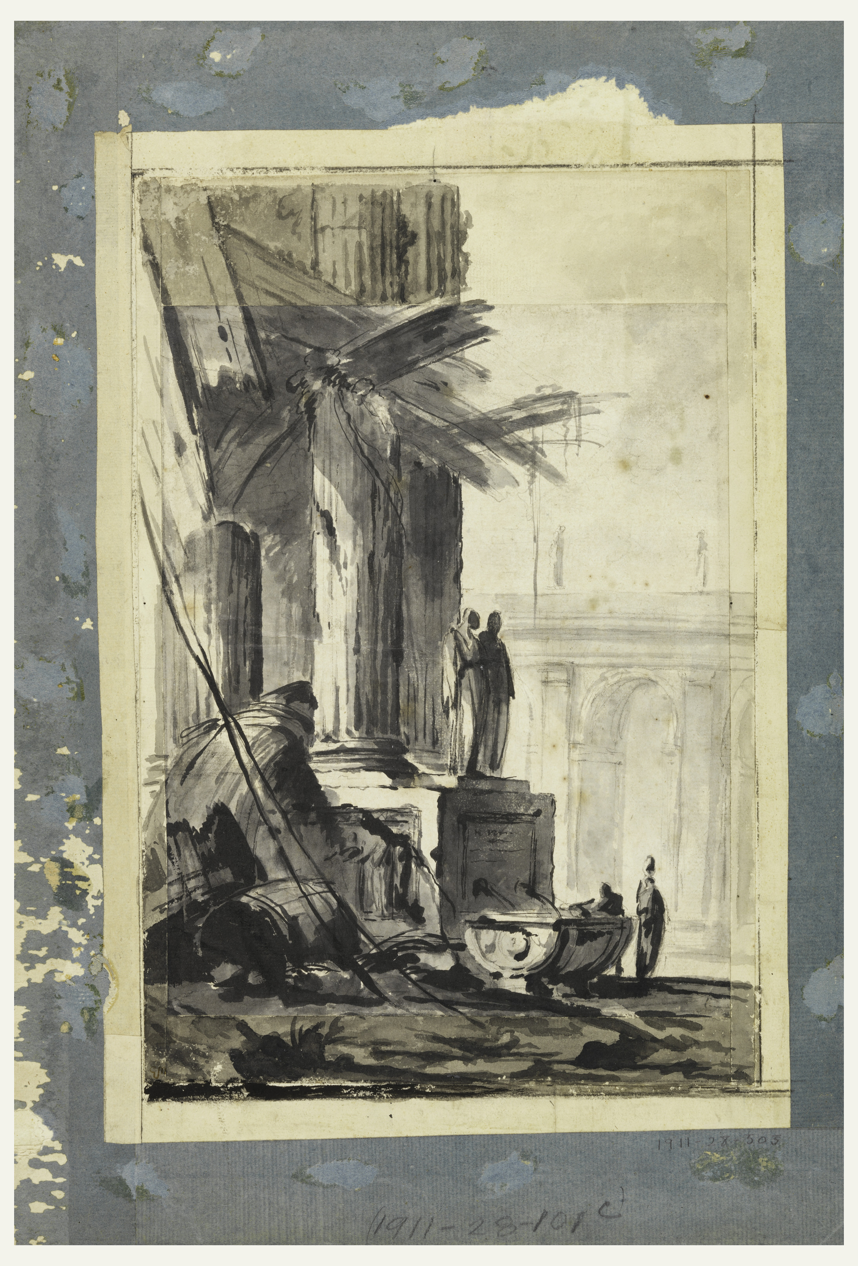 Drawing, Ruin Fantasy; Louis-Joseph Le Lorrain (French, 1715–1759); France; brush and black, gray wash, black chalk on cream laid paper; Overall sheet size with additions: 34.9 x 23.2 cm (13 3/4 x 9 1/8 in.) Mat: 55.9 x 40.6 cm (22 x 16 in.) Original Sheet size: 26.8 x 21.4 cm (10 9/16 x 8 7/16 in.); Purchased for the Museum by the Advisory Council; 1911-28-505