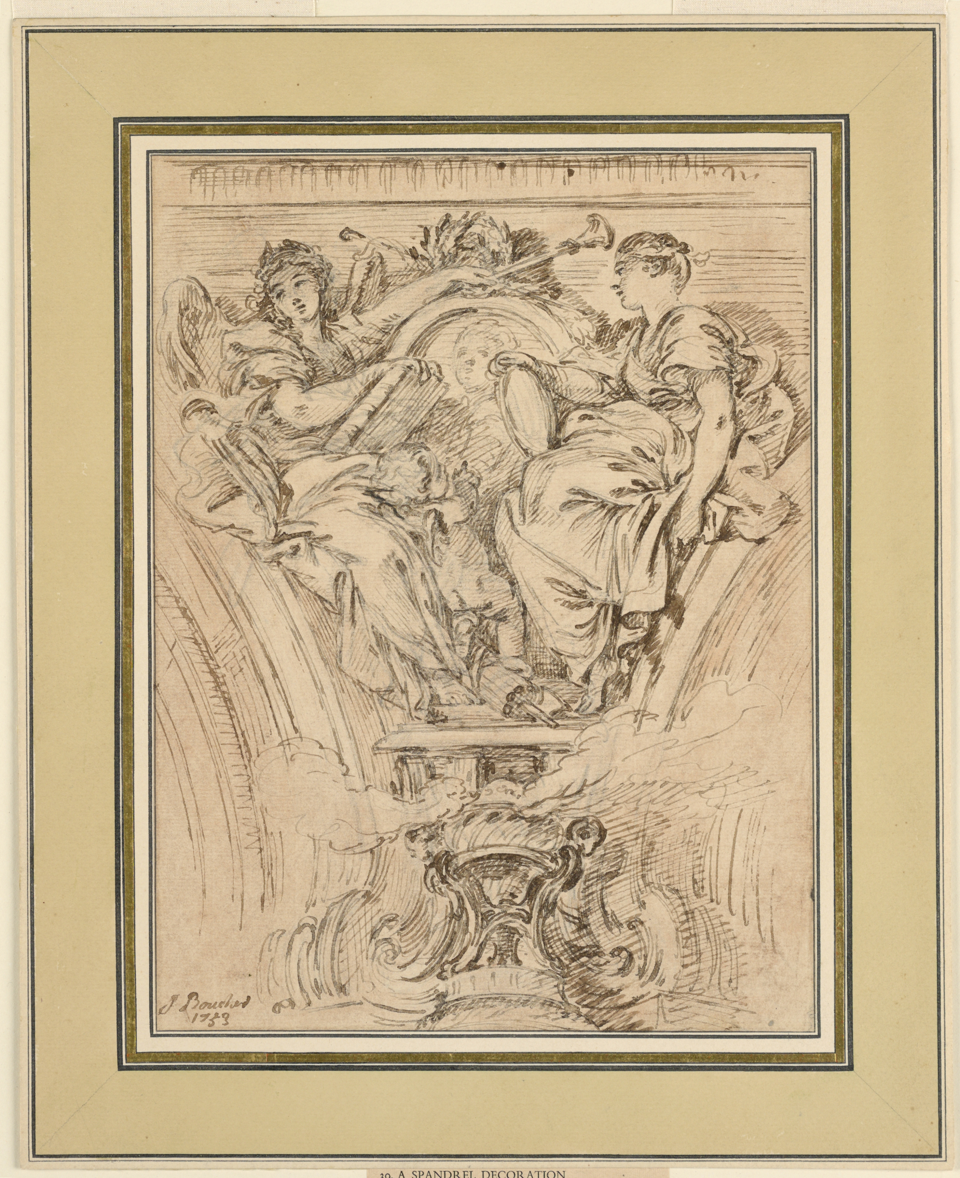 Boucher was an incredibly prolific draughtsman whose drawings were often reproduced and disseminated through prints. Still, this spandrel design was not made to be engraved but was likely a means for him to exercise his imagination. In fact, pen and ink drawings are not common in his vast graphic portfolio, and ornamental decorations executed in this media are often attributed to the early days in his career. By contrast, this drawing was produced during a fruitful period in his career and is a marker of the collision and collusion between Boucher’s diverse artistic productions.
