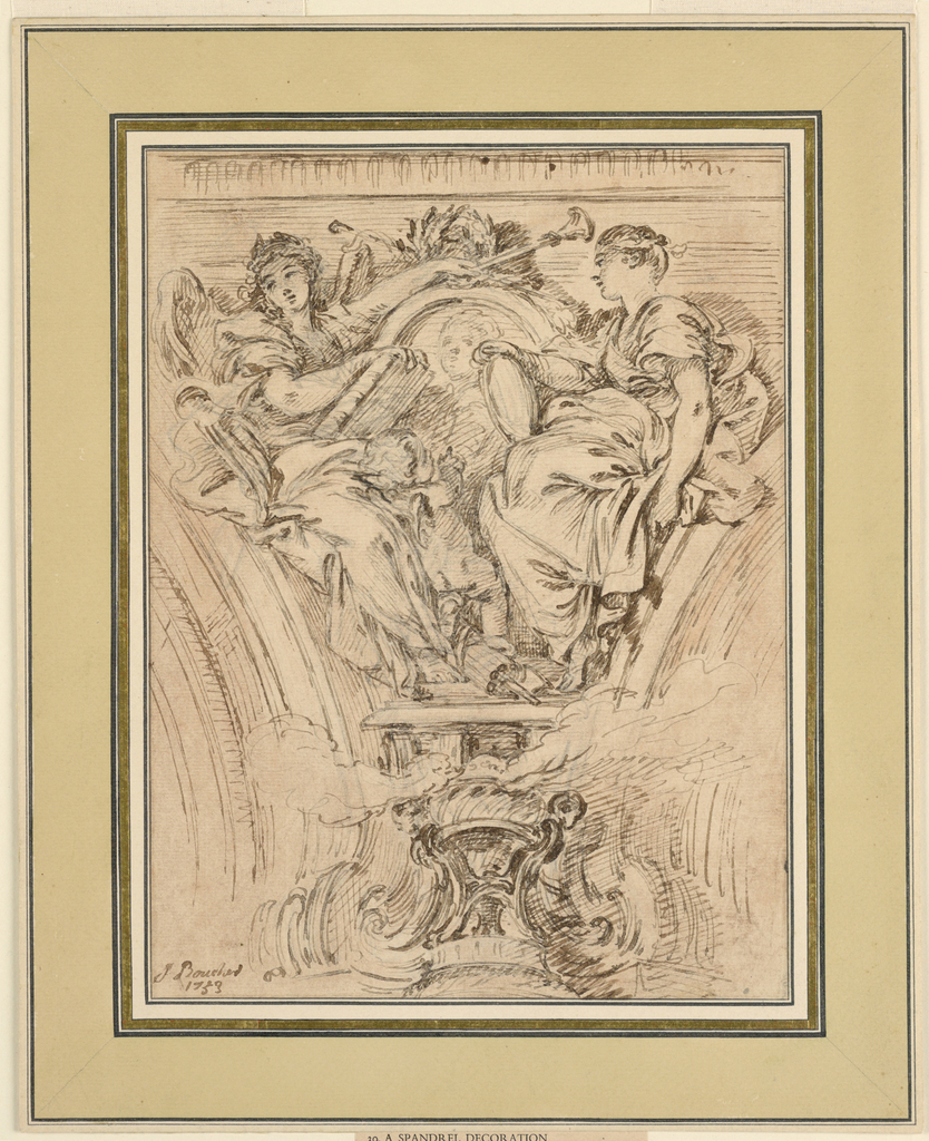 This drawing is a design for a spandrel, the roughly triangular space between the left or right exterior curve of an arch, by the French academician and painter François Boucher. The drawing is executed with black chalk, pen, brown ink and wash and represents the personification of truth and fame honoring Louis XV. In the lower left corner, Boucher has signed and dated the drawing.