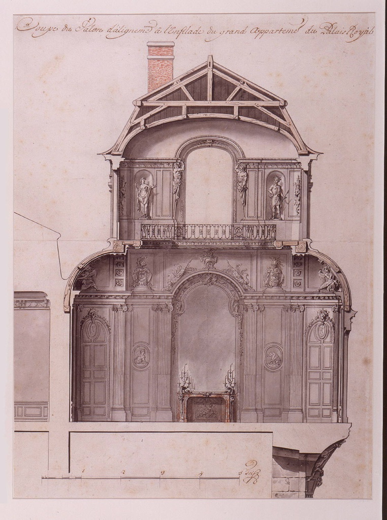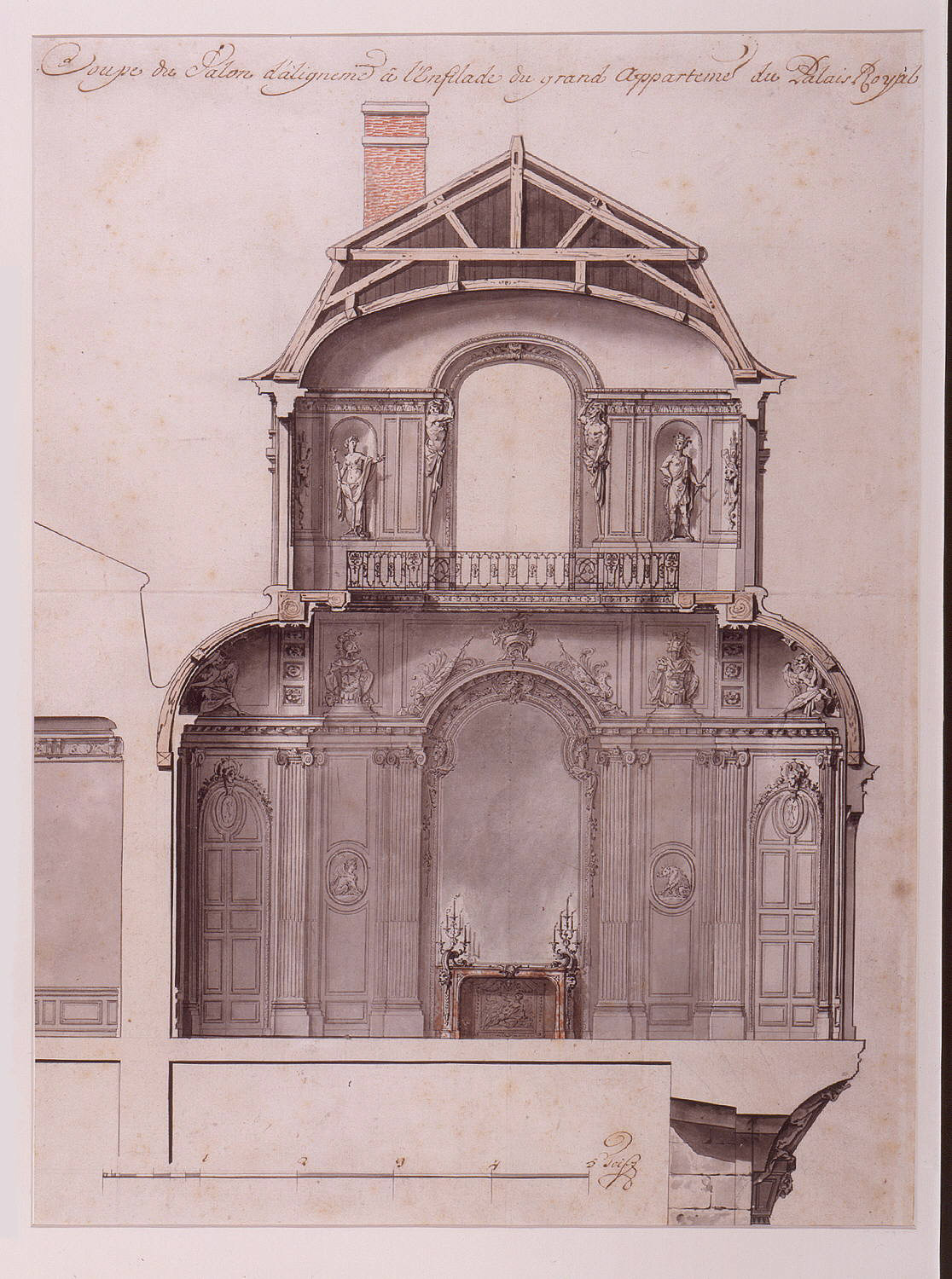 Inscribed in pen and brown ink across top of sheet: Coupe du Salon d'alignement à l'Enfilade du grand Apartement du Palais Royal; lower left: the scale 5 Toises.