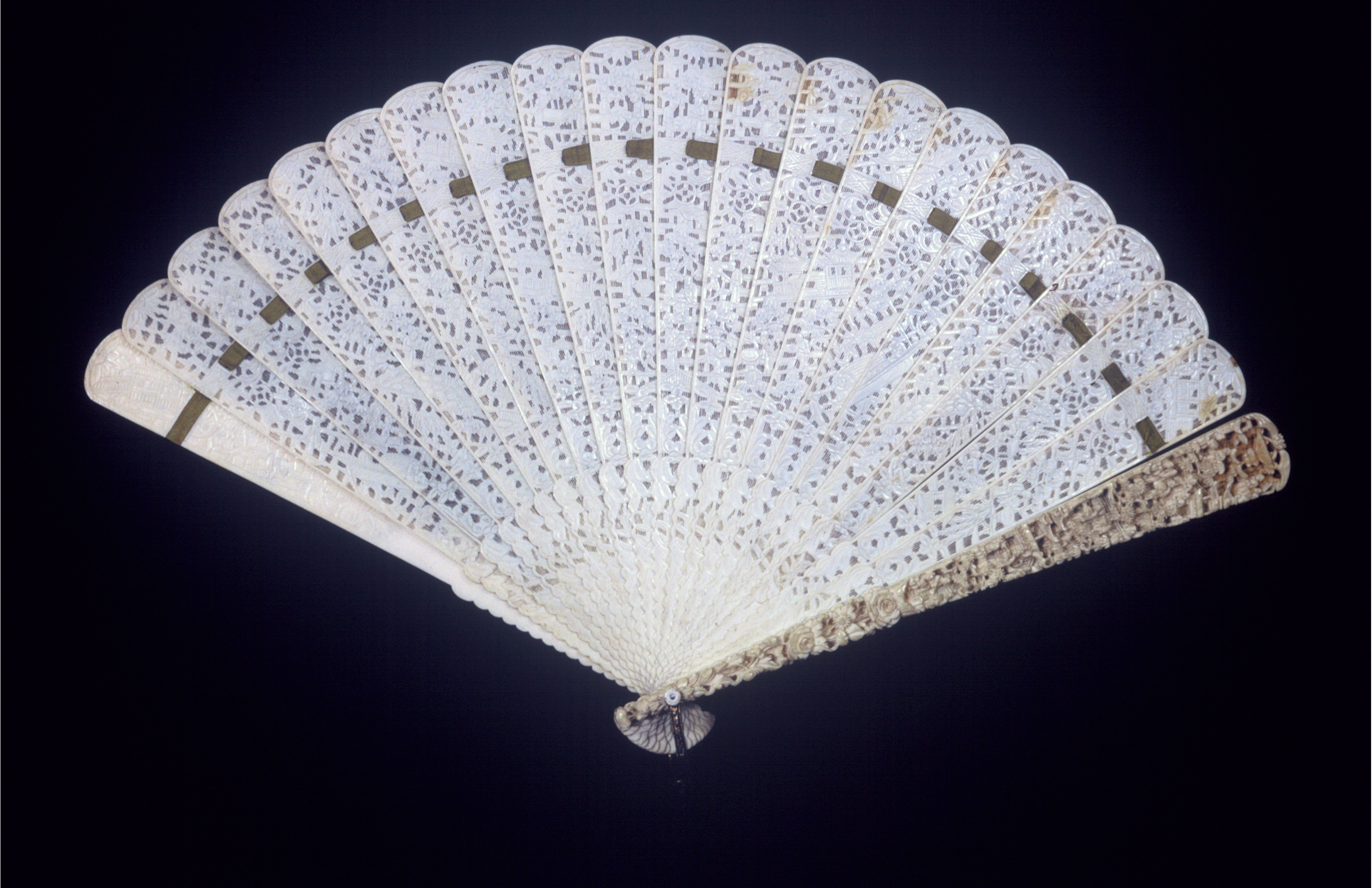 This is a Brisé fan. It is dated 1840–60 and we acquired it in 1912. Its medium is carved and pierced ivory sticks, silk ribbon. It is a part of the Textiles department.