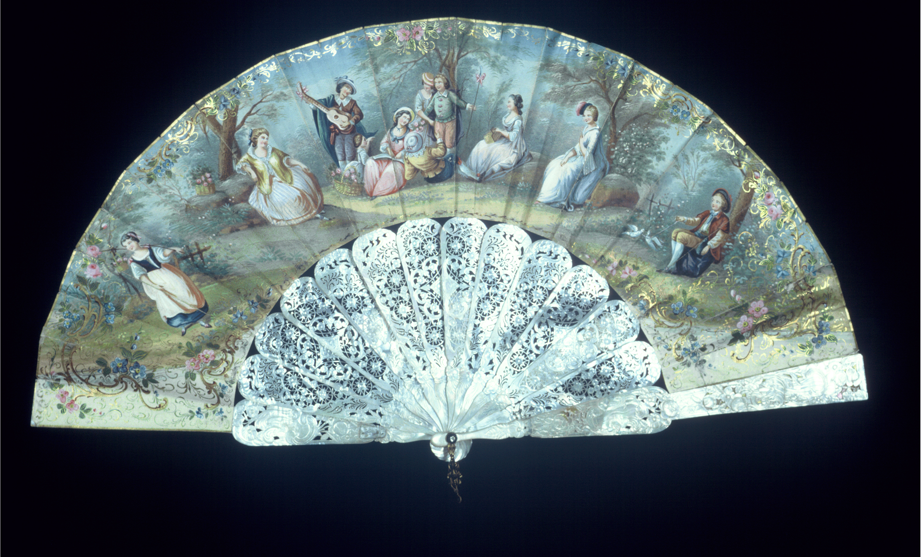This is a Pleated fan. It is dated ca. 1840 and we acquired it in 1912. Its medium is paper leaf with gilded and hand-colored lithograph; carved and pierced mother-of-pearl sticks. It is a part of the Textiles department.