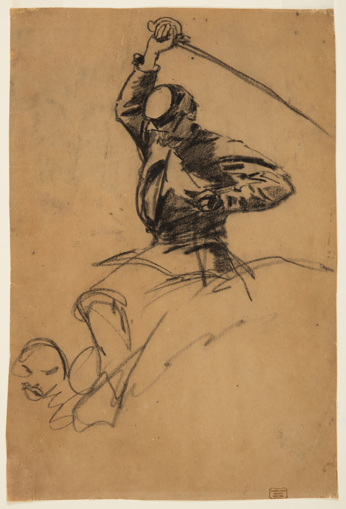 Drawing, Cavalry Soldier with Sword on Horseback; Winslow Homer (American, 1836–1910); USA; black chalk on tan wove paper [darkened], lined ; 36.6 x 24.1 cm (14 7/16 x 9 1/2 in.); Gift of Charles Savage Homer, Jr.; 1912-12-107