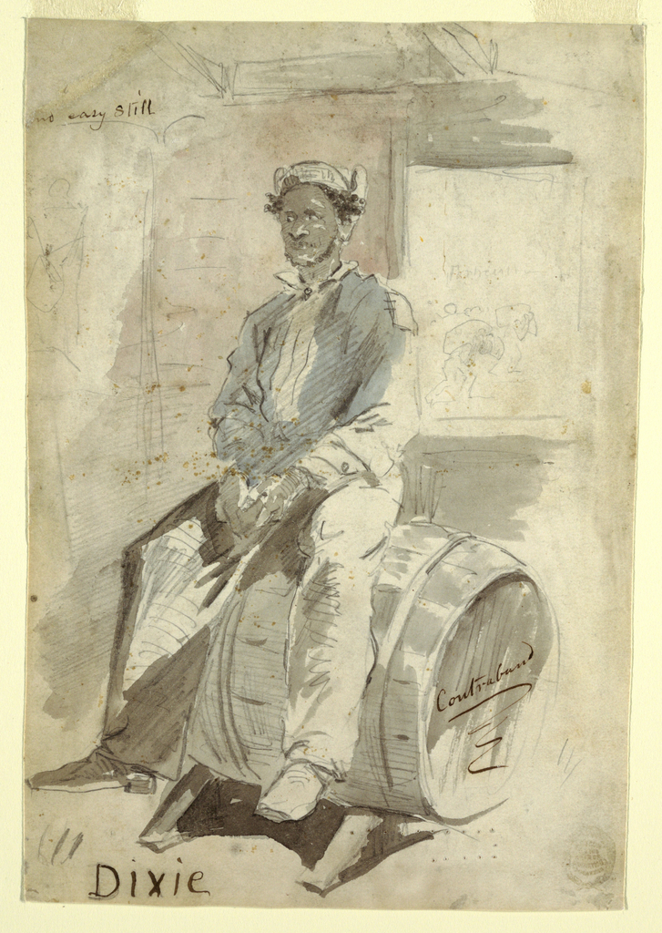 Inscribed in brown ink, at top: "DIXIE; at end of barrel: Contraband; and at top left: An easy still; and in graphite, over women in background: Far trees.