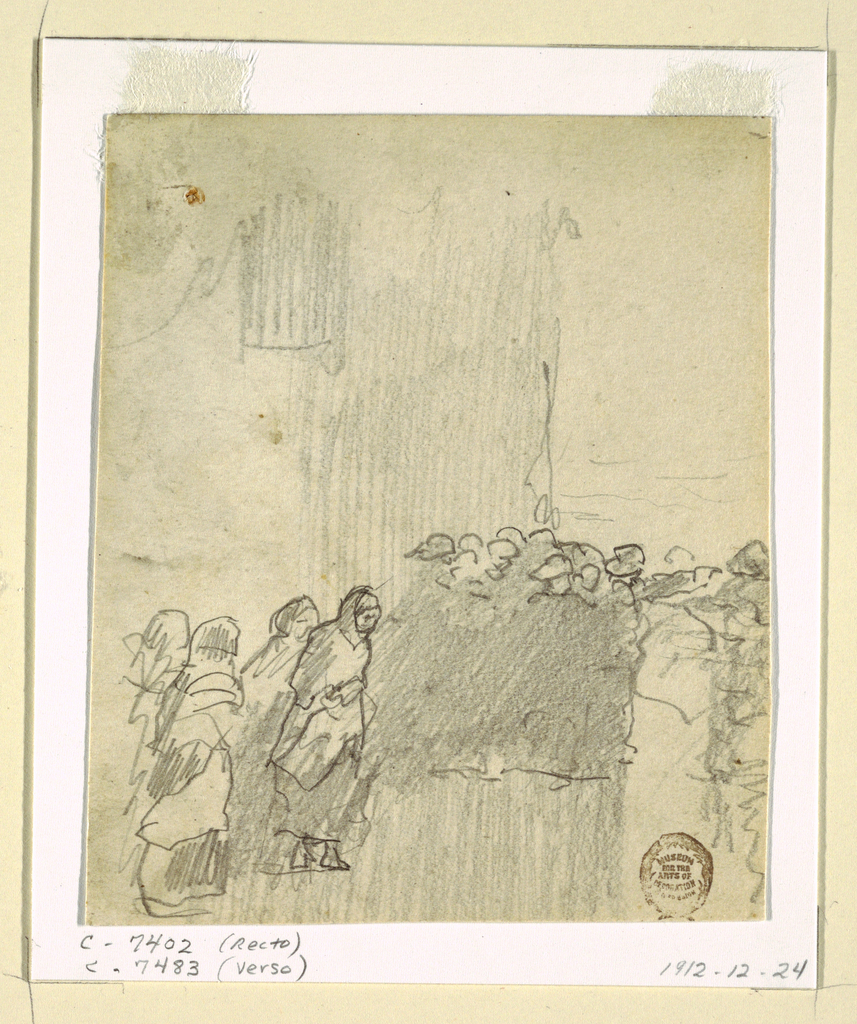 Drawing, Men and Women Looking Out to Sea, Cullercoats, England; Winslow Homer (American, 1836–1910); USA; graphite on heavy cream wove paper; verso: violet crayon; 17.5 × 14.1 cm (6 7/8 × 5 9/16 in.); Gift of Charles Savage Homer, Jr.; 1912-12-24