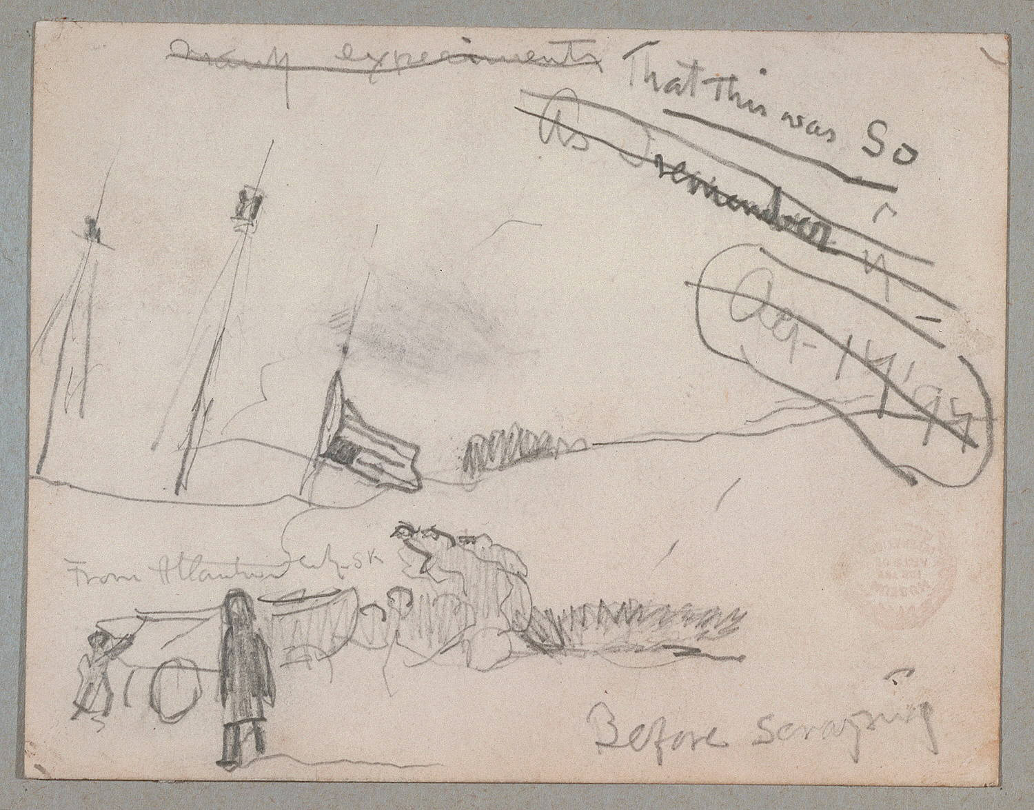 Recto: across top in graphite, then crossed out: many experiments upper right in graphite: that this was so [underlined] / as I remember it / "Oct. 17 '97" [crossed out]. at lower right in graphite: Before scraping at lower left in graphite: From Atlantic.... SK Verso: Inscribed in black ink on printed invitation: Mr. Winslow Homer (in ink) / The Pittsburgh Club / at the request of / Mr. [crossed out] The Board of Governors (in ink) / respectfully tender to you the privileges / of their Club House for fifteen days. / 125 Penn Ave. / Oct. 12, 1897 (in ink) lower right in graphite: (252) (upsidedown).