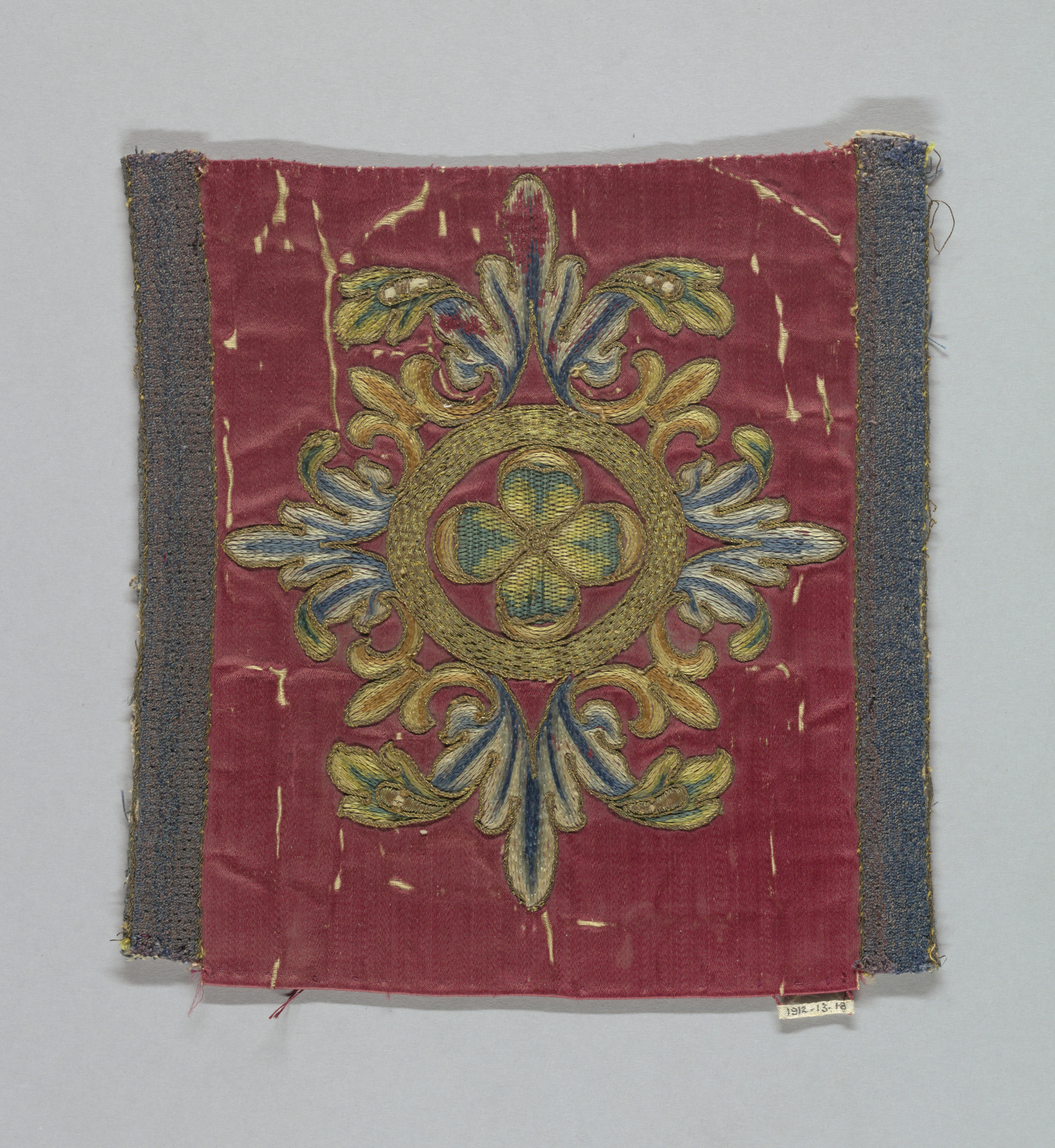 This is a Fragment. It is dated 16th century and we acquired it in 1912. Its medium is silk, metallic thread and its technique is embroidered on satin weave. It is a part of the Textiles department.