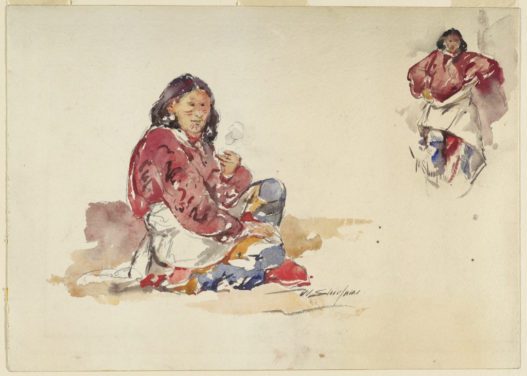 Signed with brush and watercolor, below each figure: "W. Shirlaw"