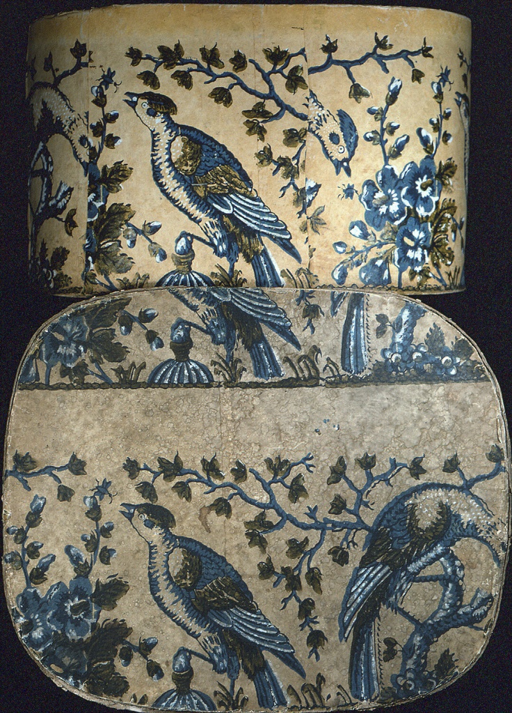 This is a Bandbox. It is dated ca. 1830 and we acquired it in 1913. Its medium is block-printed on paper, pasteboard support. It is a part of the Wallcoverings department.