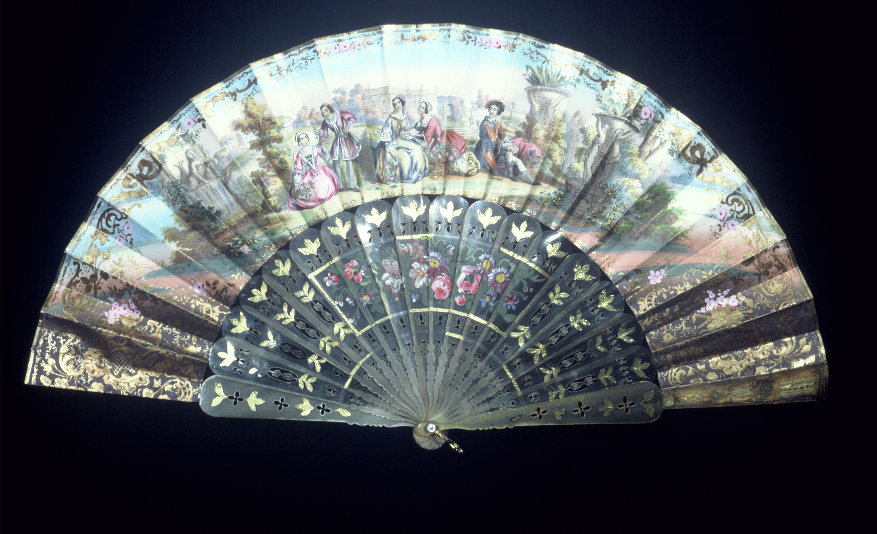 This is a Pleated fan. It is dated mid- 19th century and we acquired it in 1916. Its medium is paper leaf with gilded and hand-colored lithograph; pierced, gilded and painted horn sticks. It is a part of the Textiles department.