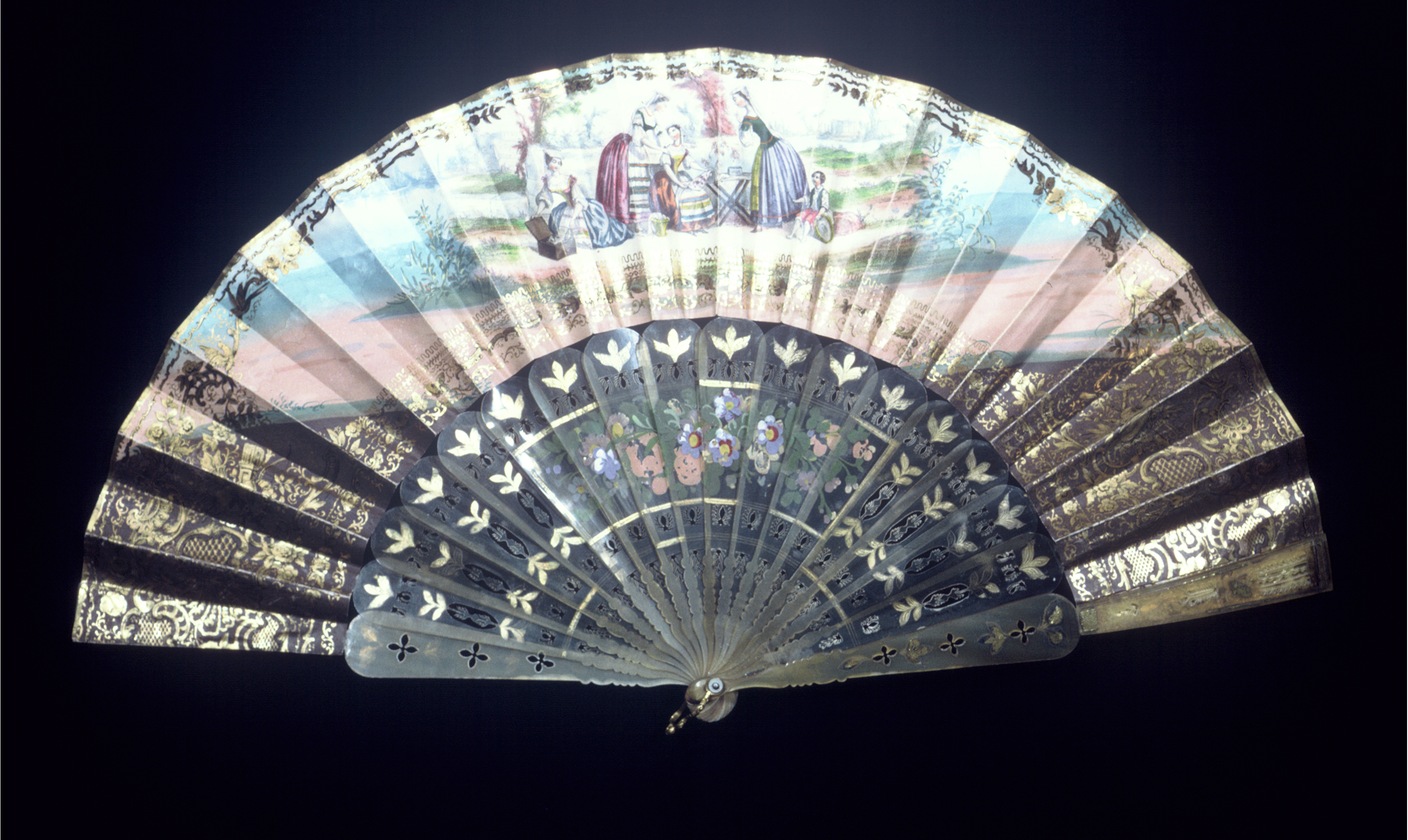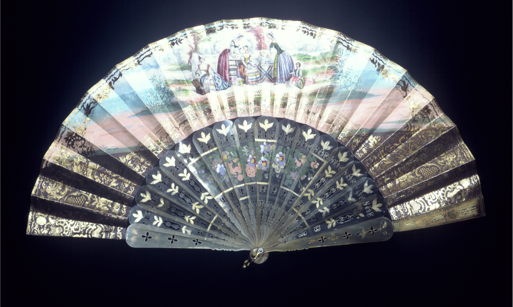 This is a Pleated fan. It is dated mid- 19th century and we acquired it in 1916. Its medium is paper leaf with gilded and hand-colored lithograph; pierced, gilded and painted horn sticks. It is a part of the Textiles department.