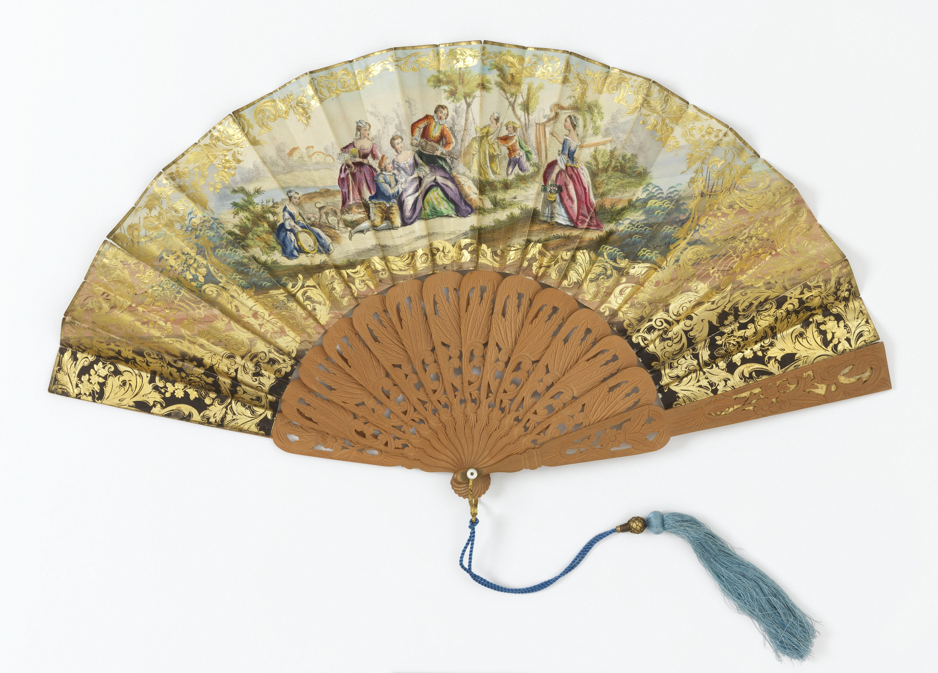 This is a Pleated fan. It is dated ca. 1840 and we acquired it in 1916. Its medium is paper leaf with gilded chromolithograph; carved and pierced wood sticks; blue silk tassel. It is a part of the Textiles department.