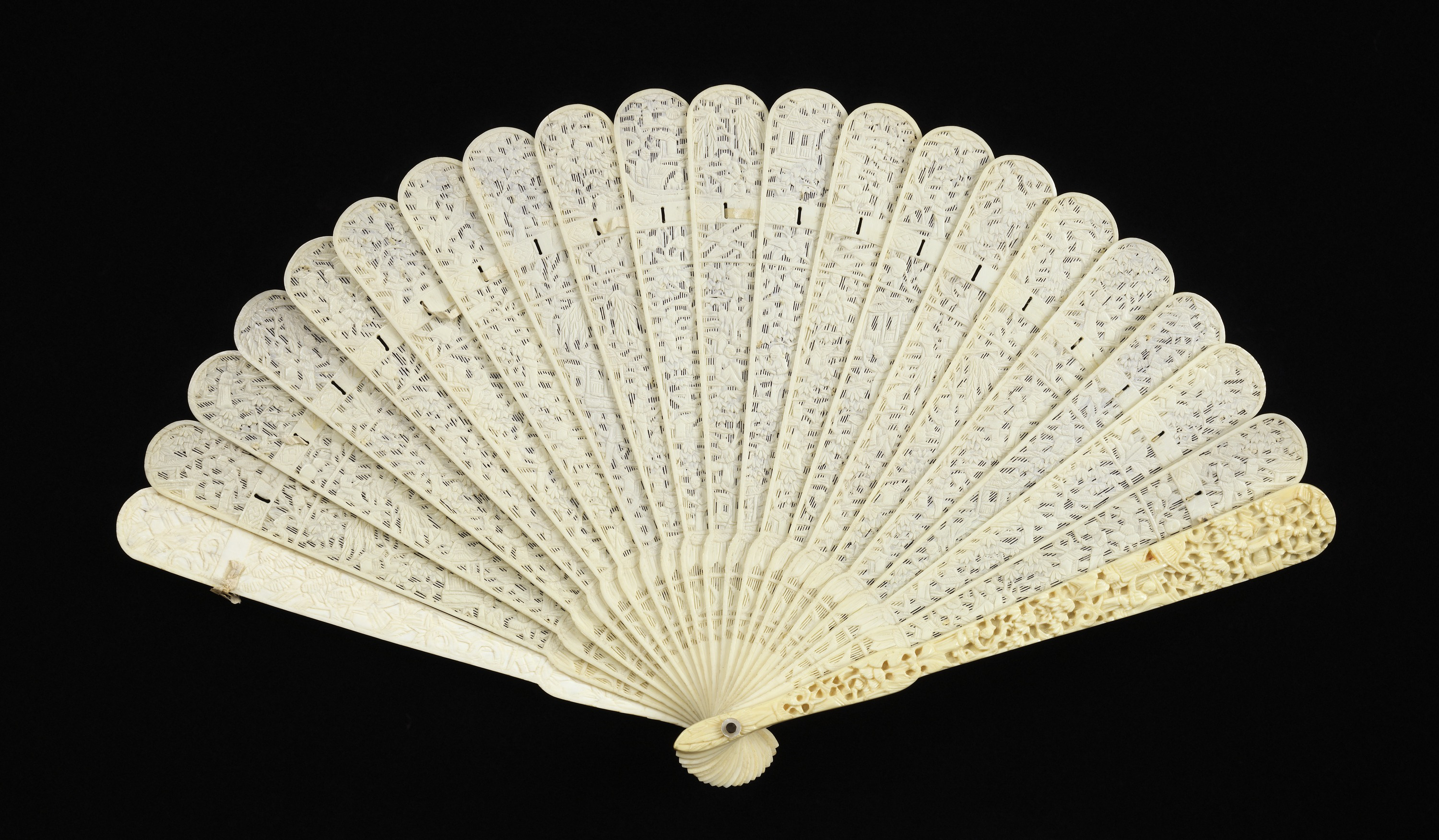 This is a Brisé fan. It is dated ca. 1860 and we acquired it in 1916. Its medium is carved and pierced ivory sticks. It is a part of the Textiles department.