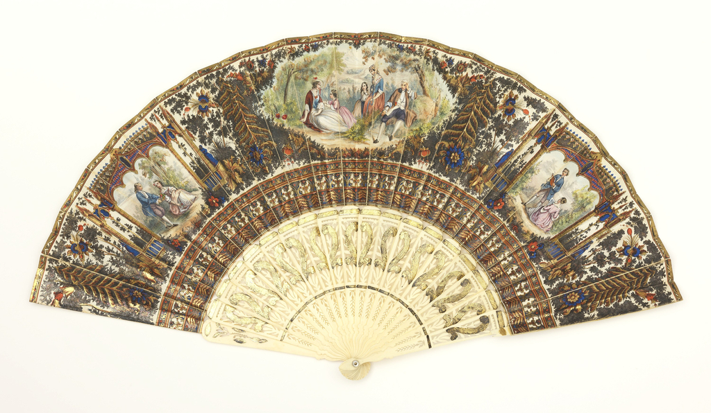 This is a Pleated fan. It is dated 1840–1860 and we acquired it in 1916. Its medium is paper leaf with gilded chromolithograph; carved and pierced bone sticks. It is a part of the Textiles department.