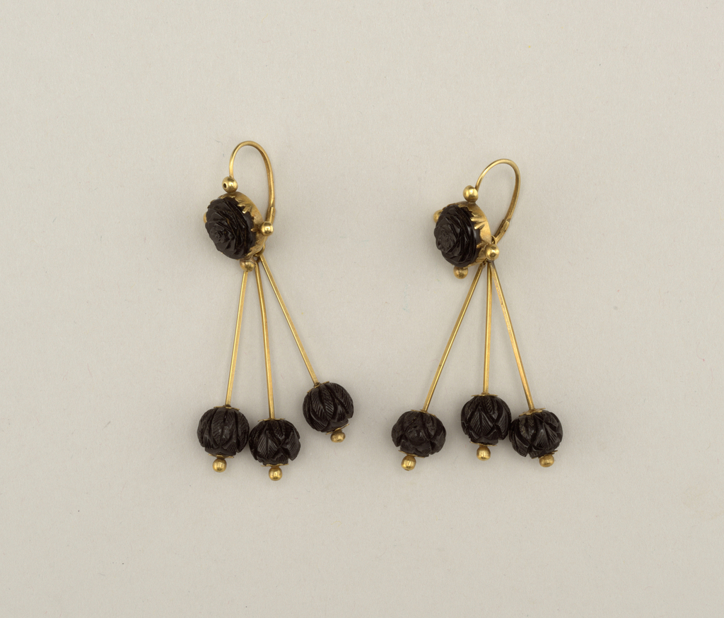 This is a Earring. It is dated ca. 1840 and we acquired it in 1916. Its medium is gold, bog wood. It is a part of the Product Design and Decorative Arts department.
