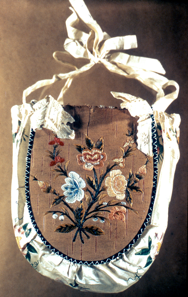 This is a Bag. It is dated 1800–1850 and we acquired it in 1916. Its medium is silk, birch bark, grass stems and its technique is painted silk plain weave; birch bark embroidered with stem, satin and knot stitches using dyed grass stems. It is a part of the Textiles department.