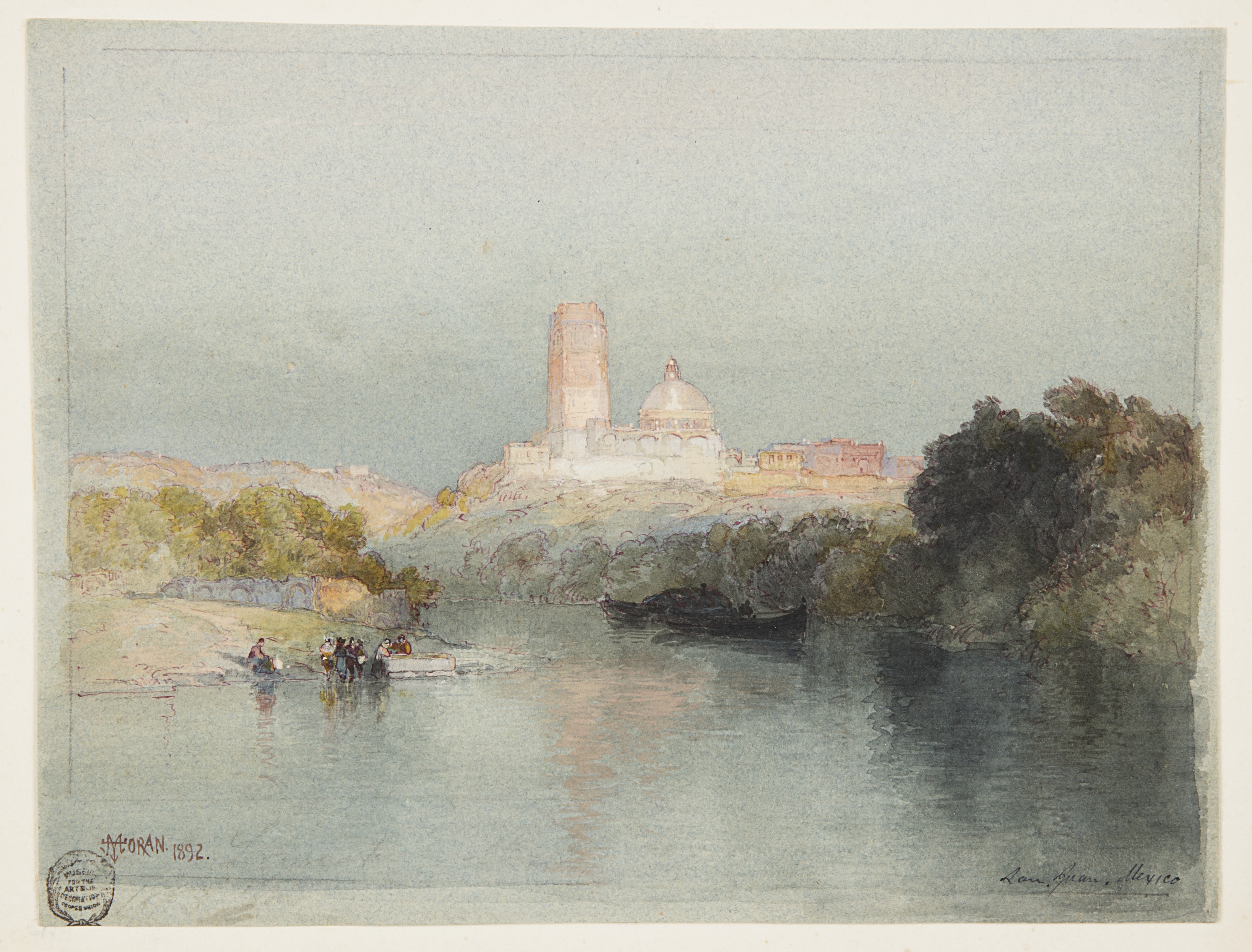 Recto: Inscribed in pen and blue ink, lower right: San Juan, Mexico. Mount: Inscribed in pen and black ink, upper right margin: 20; again at upper center margin: watercolor on gray paper.; and in pen and blue ink, lower left margin: The Hacienda of San Juan Mexico; and in pen and black ink at lower center margin: T. Moran, 1892. Verso: Insribed in graphite: San Juan./On the Lerma River/ Mexico/TMoran/37 w 22.