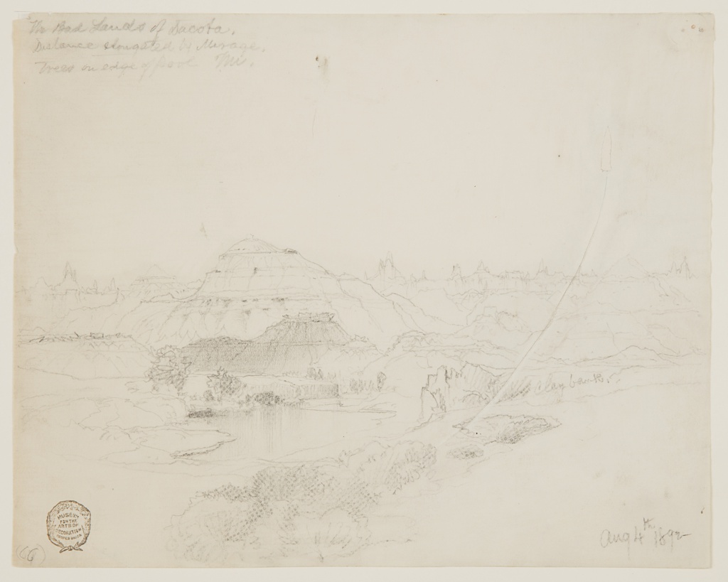 Inscribed in graphite, abover left: The Bad Lands of Dakota / Distance elongated by mirage/ trees on ege of pool T. M.; and again in lower right corner: Aug. 4th 1892.