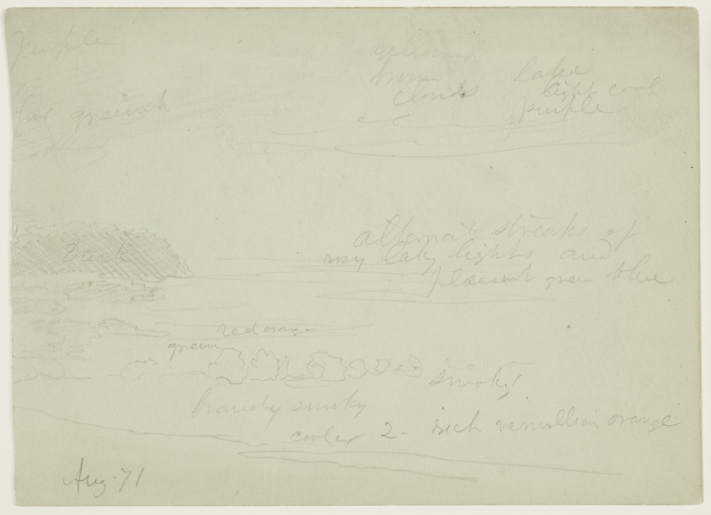 Inscribed: in graphite, upper left: purple / blur greenish; in graphite, upper center: Yellowish / from / clouds; in graphite, upper right: lake / light cool / purple; in graphite, center left: Dark; in graphite, center: rosy; in graphite, center right: alternating streaks of / laky lights and / pleasant green blue; in graphite, lower left: Aug - 71; in graphite, lower center: red orange / green / smoky / brandy smoky / cooler 2 - rich vermillion orange