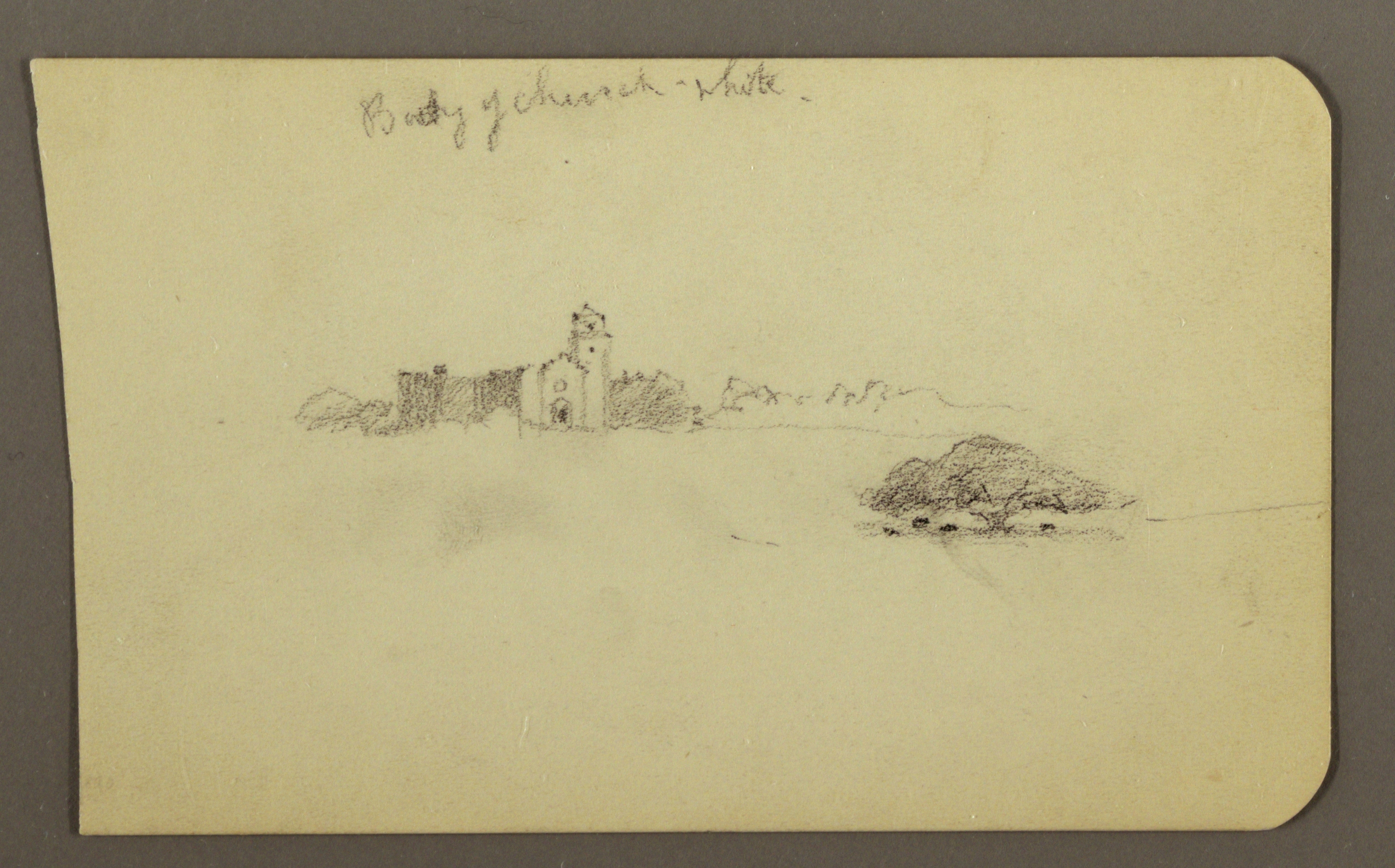 Drawing, Church and a Tree, Mexico; Frederic Edwin Church (American, 1826–1900); USA; graphite on off-white wove paper; 10.2 × 17 cm (4 × 6 11/16 in.); Gift of Louis P. Church; 1917-4-1055-b