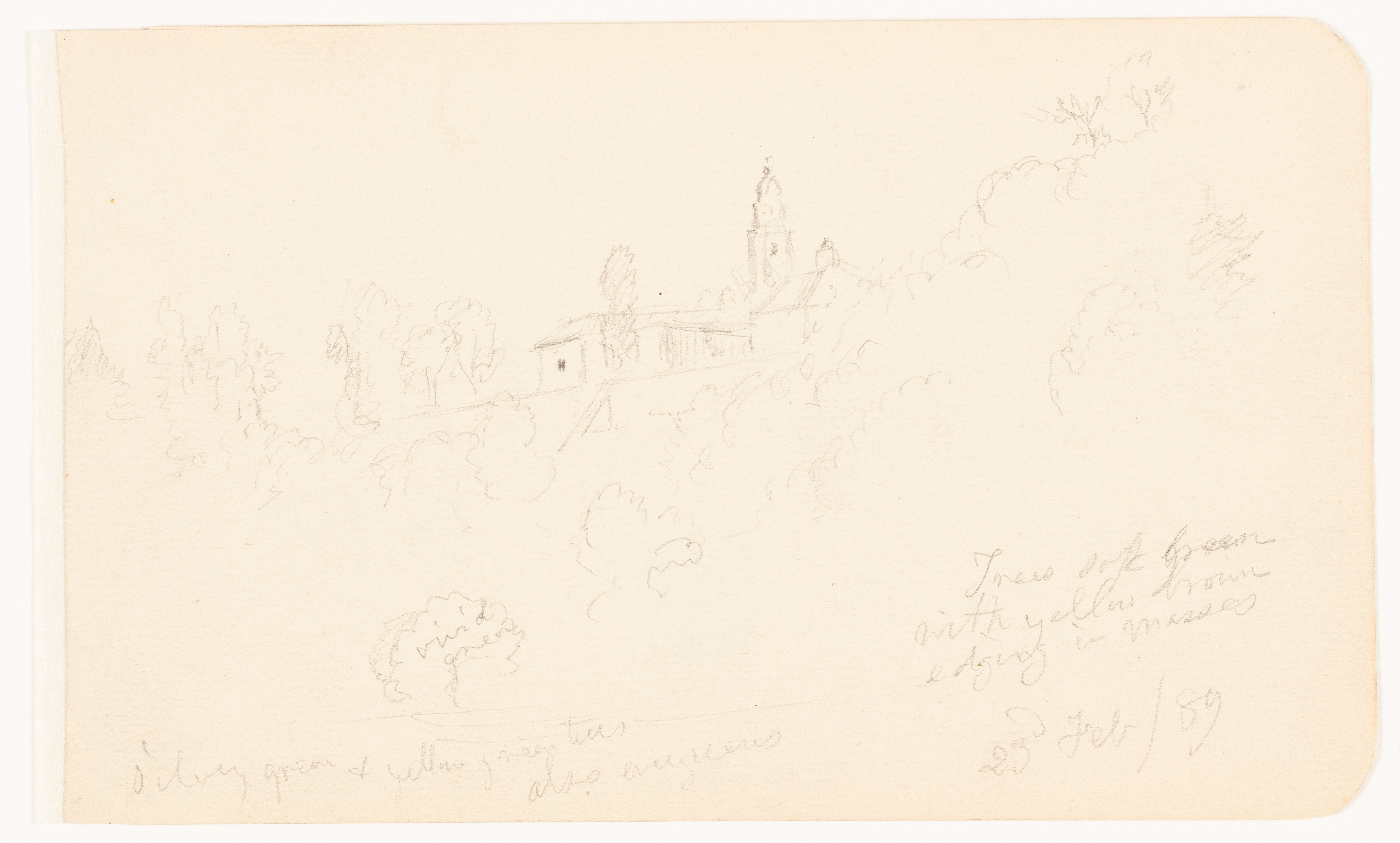 This is a Drawing. It was created by Frederic Edwin Church. It is dated February 23, 1889 and we acquired it in 1917. Its medium is graphite on off-white wove paper; verso: graphite. It is a part of the Drawings, Prints, and Graphic Design department.
