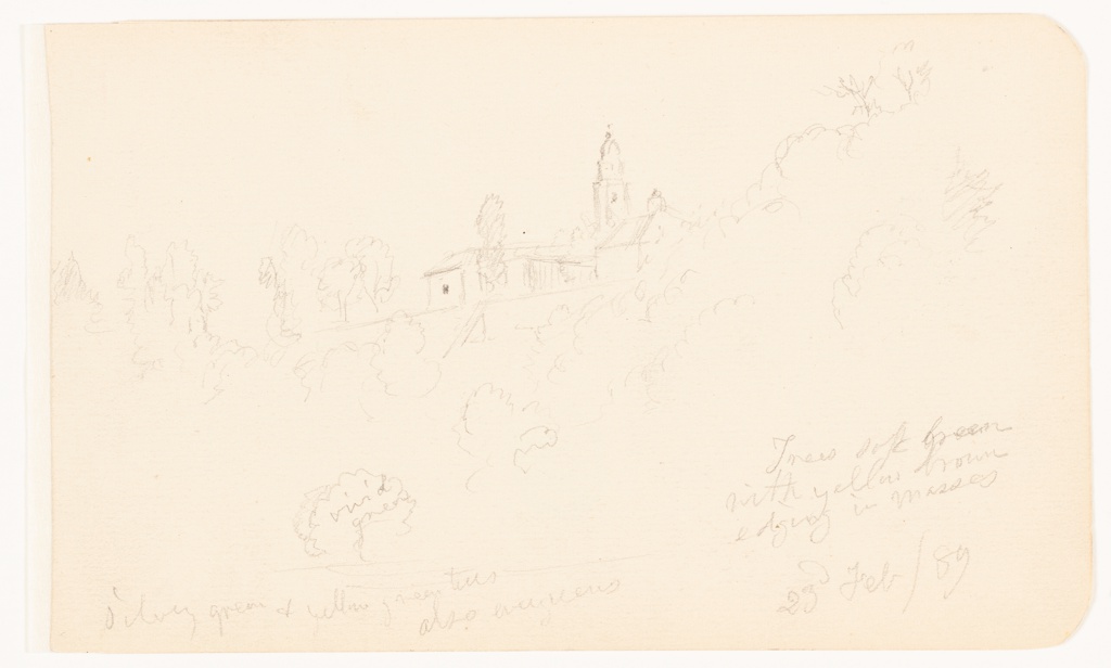 Inscribed: in graphite, lower left: vivid / green / silvery green & yellow green trees / also evergreens; in graphite, lower right: Trees soft green / with yellow brown / edging in masses / 23d Feb /89