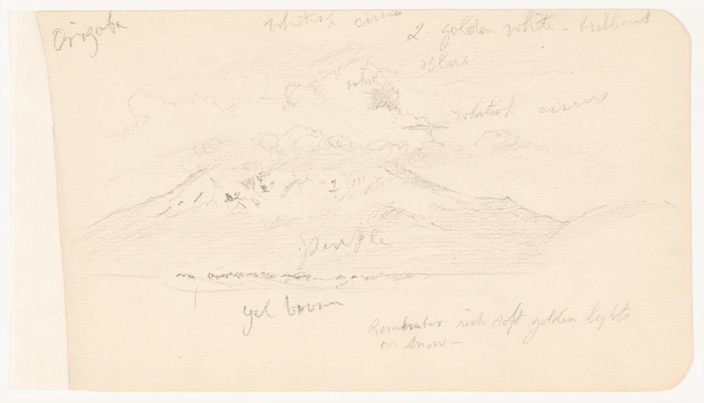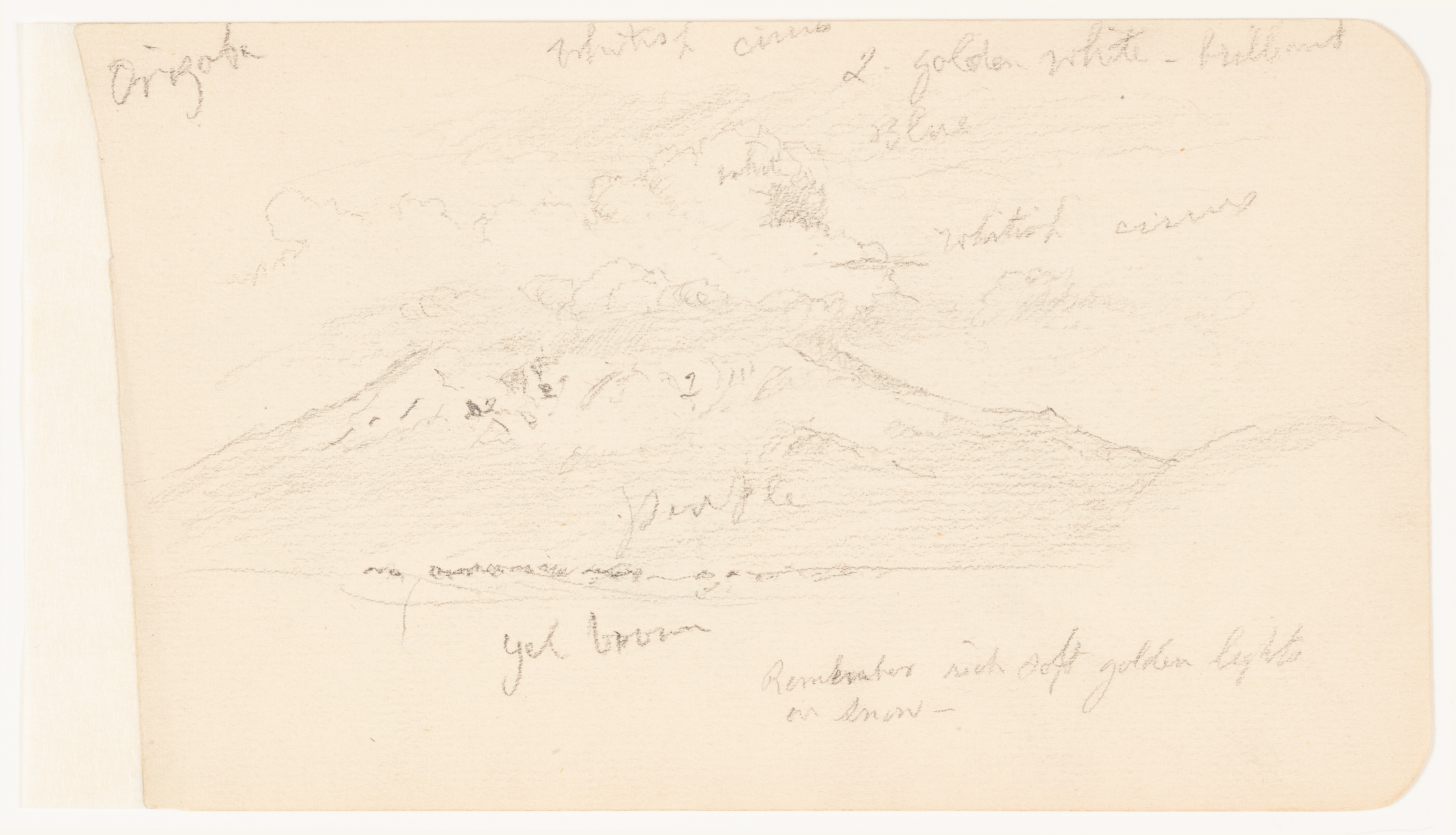 Inscribed in graphite, upper left: Orizaba; in graphite, upper center: whitish cirrus / white; upper right: 2 - golden white - Brilliant / Blue / whitish cirrus; center: 2 2 2 / purple; lower center: yel brown / Remember rich soft golden lights / on snow -