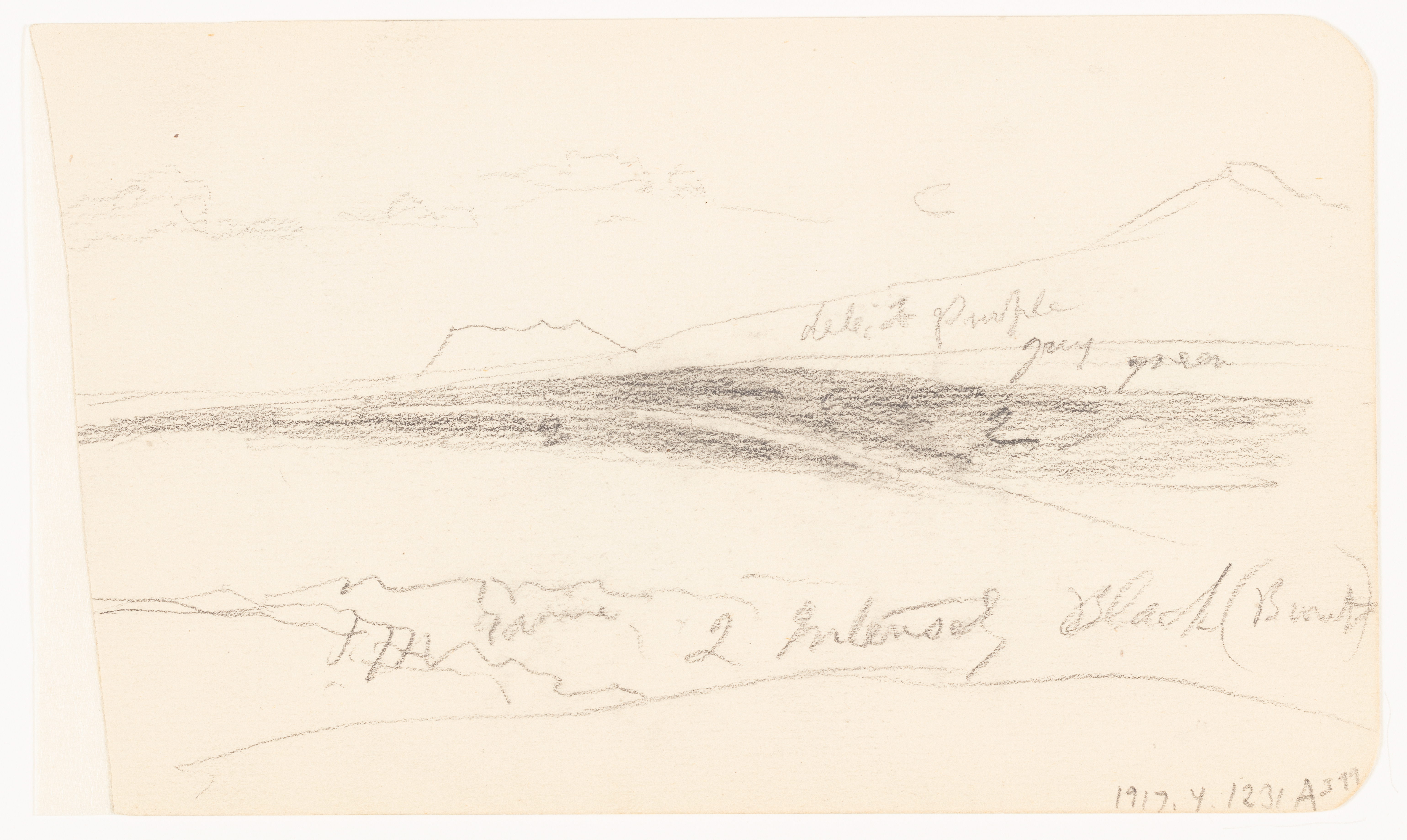 Inscribed: in graphite, verso center: delicate purple / grey green / 2 2; in graphite, verso lower center: ravine / 2 Intensely Black (Burnt)