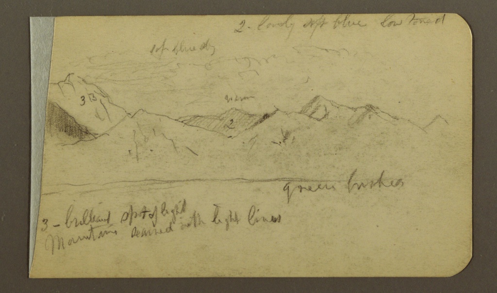 Inscribed: in graphite, upper center: 2 - lovely soft blue low toned / soft blue sky; in graphite, center left: 3 B; in graphite, center: warm / 2 / green bushes; in graphite, lower left: 3 - brilliant spot of light / Mountains seamed with light lines; in graphite, verso upper right: 2 - soft light brown; in graphite, verso center: 2 2 2 / Trees / Burnt; in graphite, lower left: Pale yellow / Black