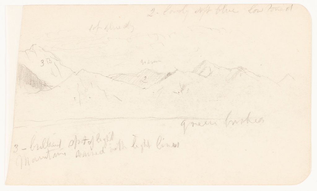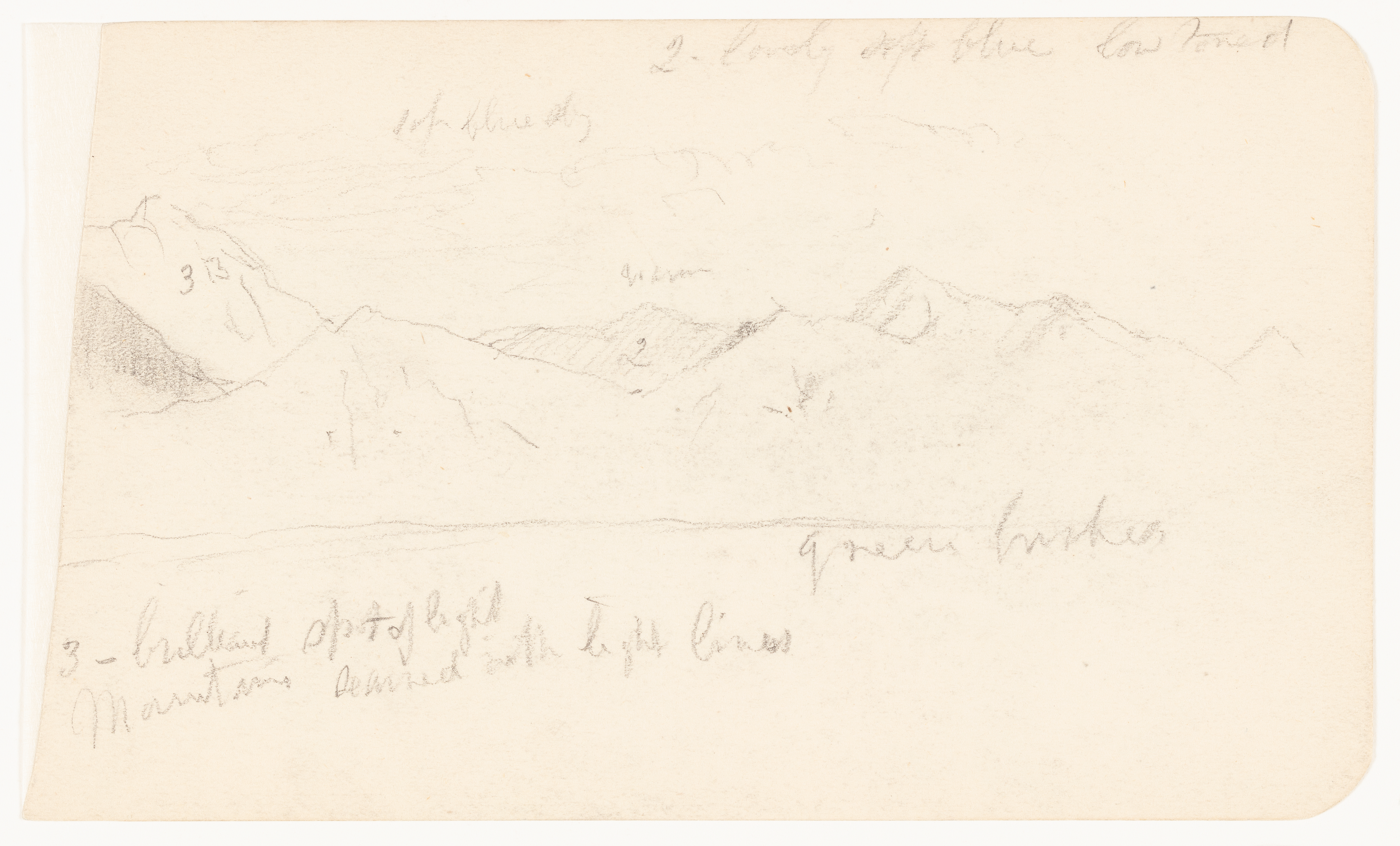 Inscribed: in graphite, upper center: 2 - lovely soft blue low toned / soft blue sky; in graphite, center left: 3 B; in graphite, center: warm / 2 / green bushes; in graphite, lower left: 3 - brilliant spot of light / Mountains seamed with light lines; in graphite, verso upper right: 2 - soft light brown; in graphite, verso center: 2 2 2 / Trees / Burnt; in graphite, lower left: Pale yellow / Black