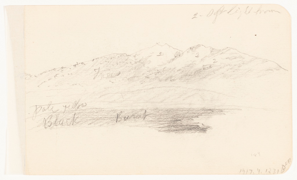 Inscribed: in graphite, upper center: 2 - lovely soft blue low toned / soft blue sky; in graphite, center left: 3 B; in graphite, center: warm / 2 / green bushes; in graphite, lower left: 3 - brilliant spot of light / Mountains seamed with light lines; in graphite, verso upper right: 2 - soft light brown; in graphite, verso center: 2 2 2 / Trees / Burnt; in graphite, lower left: Pale yellow / Black