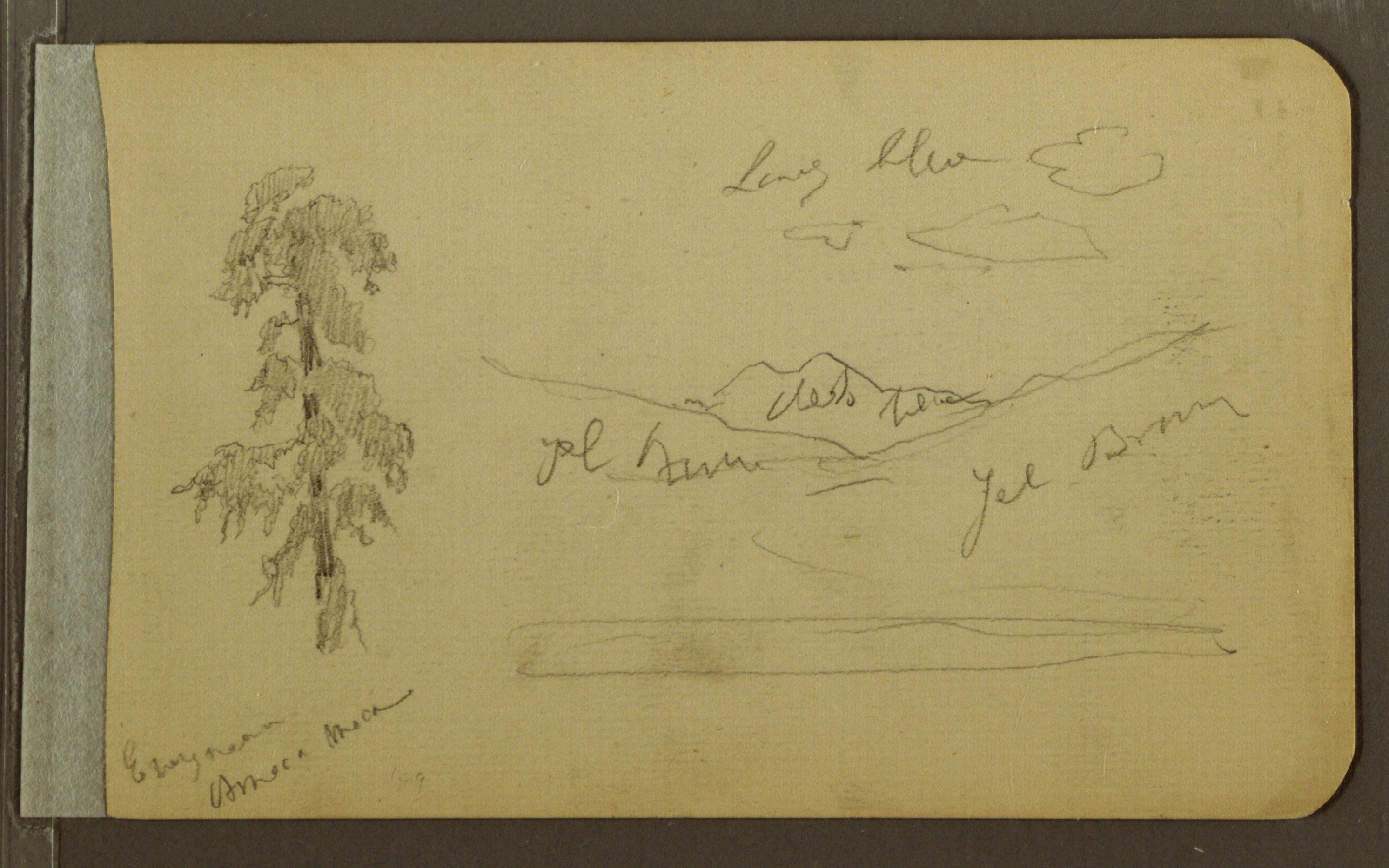 Drawing, Mountains and an Evergreen, Mexico; Frederic Edwin Church (American, 1826–1900); USA; graphite on off-white wove paper; verso: graphite; 10.2 × 16.8 cm (4 × 6 5/8 in.); Gift of Louis P. Church; 1917-4-1254-a