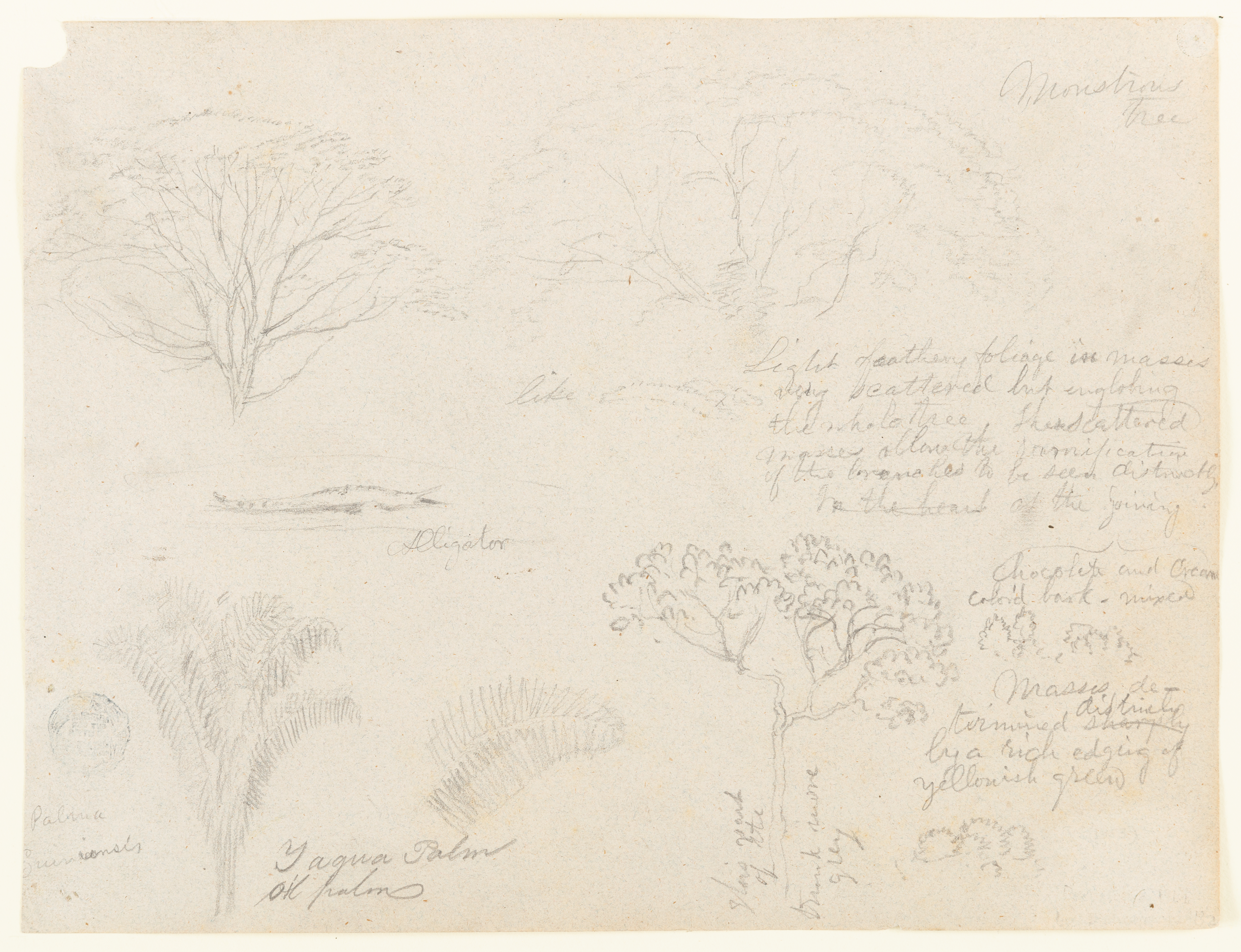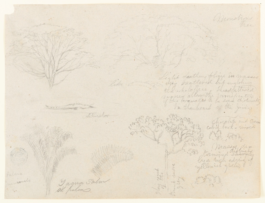 Inscribed: in graphite, upper right: Monstrous / tree; in graphite, center: like / Alligator; in graphite, center right: Light feathery foliage in masses / very scattered but englobing / the whole tree. These scattered / masses allow the ramification / of the branches to be seen distinctly / [struckout: In the heart] at the joining / chocolate and cream / color'd bark - mixed; in graphite, lower left: Palma Guiniensis / Tagua Palm / oil palm; in graphite, lower center: This part / of the / trunk more / grey; in graphite, lower right: Masses de- / termined [struckout: sharply] distinctly / by a rich edging of / yellowish green