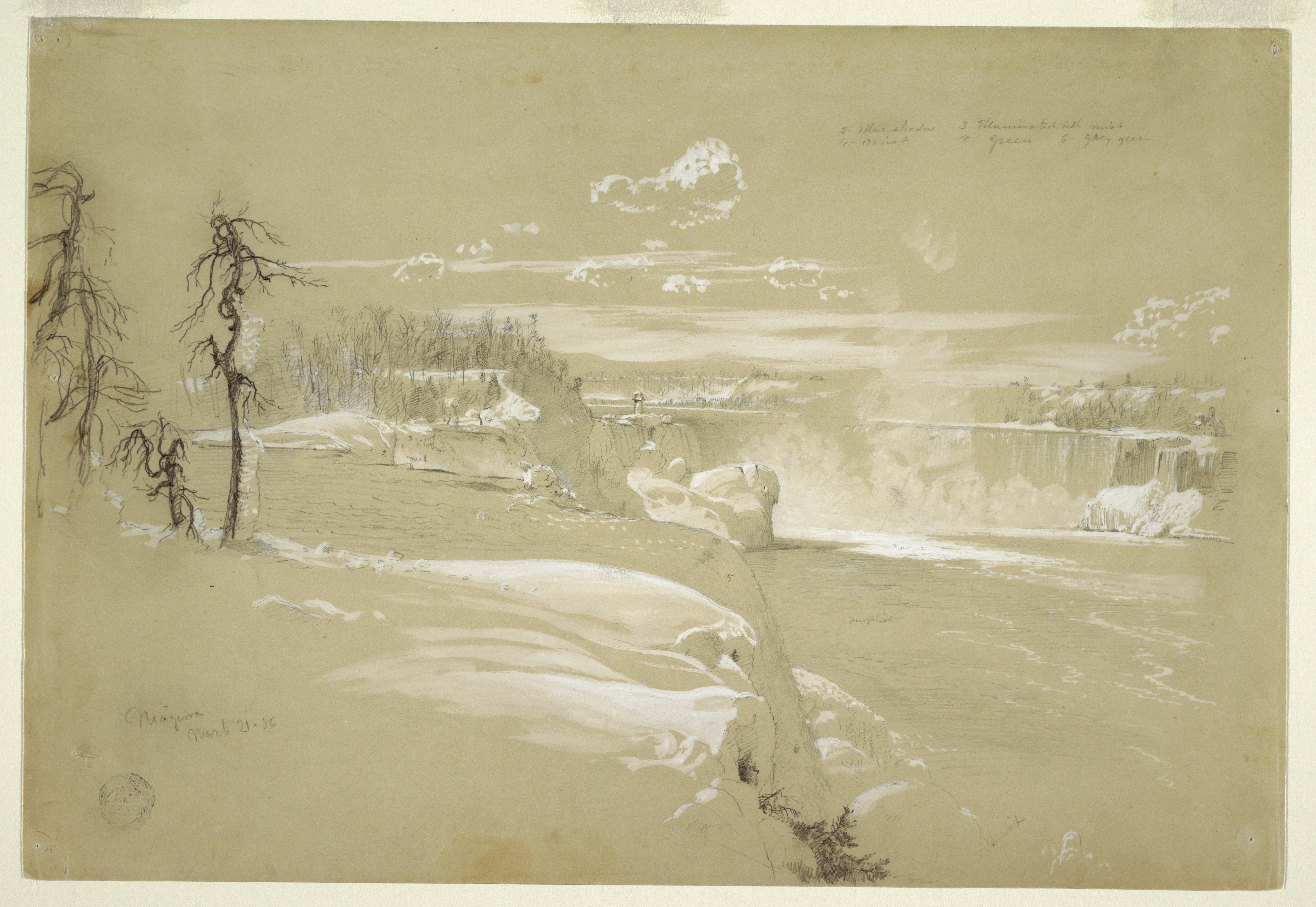 Drawing, Niagara Falls in Winter, New York; Frederic Edwin Church (American, 1826–1900); USA; graphite and white gouache on tan wove paper; 30.3 × 44.5 cm (11 15/16 × 17 1/2 in.); Gift of Louis P. Church; 1917-4-144