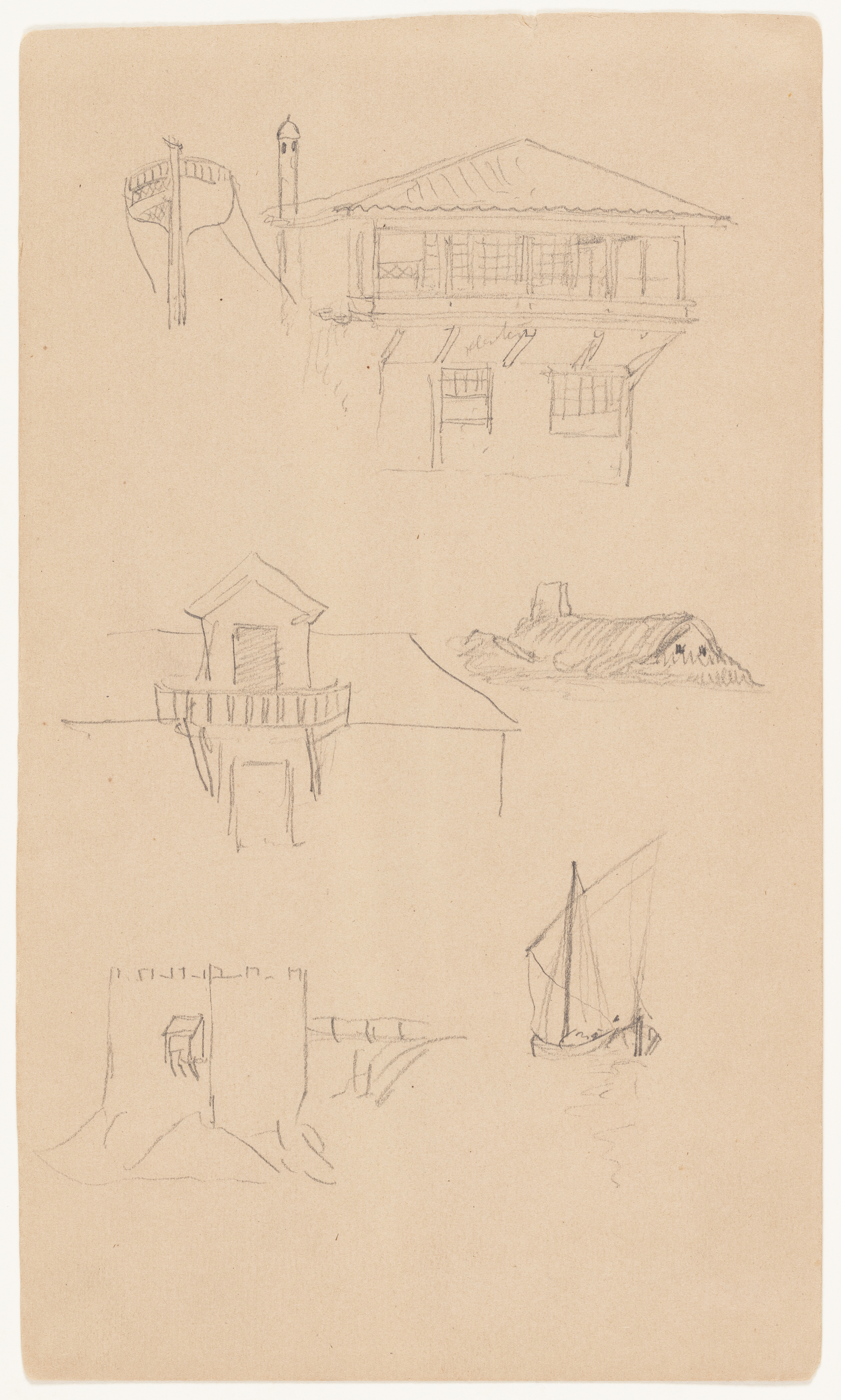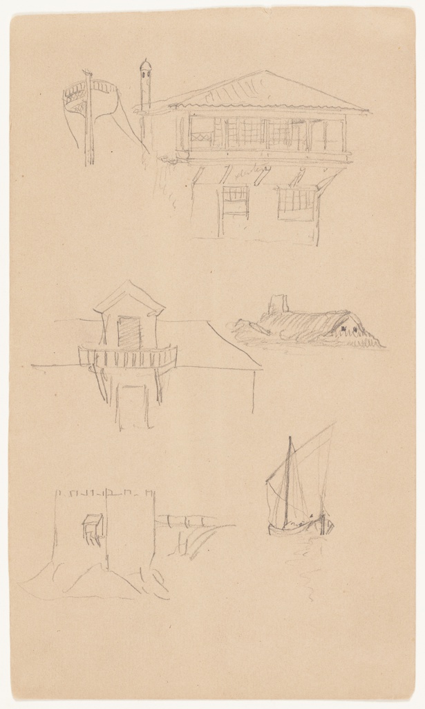 Drawing, Buildings and Boats along the Danube; Frederic Edwin Church (American, 1826–1900); USA; graphite on tan wove paper; 21.3 × 12.4 cm (8 3/8 × 4 7/8 in.); Gift of Louis P. Church; 1917-4-1458