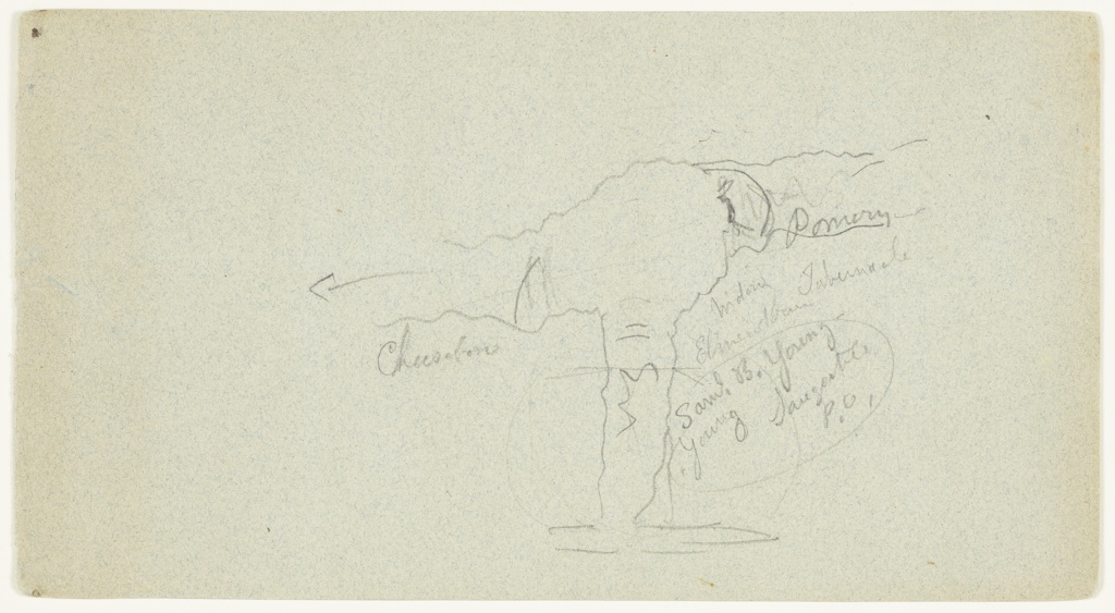 Inscribed in graphite, center: Cheesebon [?]; center right: Pomery / Widow / Tabernacle / Elmerdown / Saml. B. Young - / Young / Saugertes / P.O.