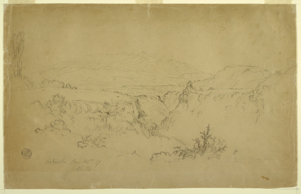 Drawing, Pichincha from the Chillo Valley, Ecuador; Frederic Edwin Church (American, 1826–1900); Ecuador; graphite on tan wove paper ; 34.4 × 54.3 cm (13 9/16 × 21 3/8 in.); Gift of Louis P. Church; 1917-4-246